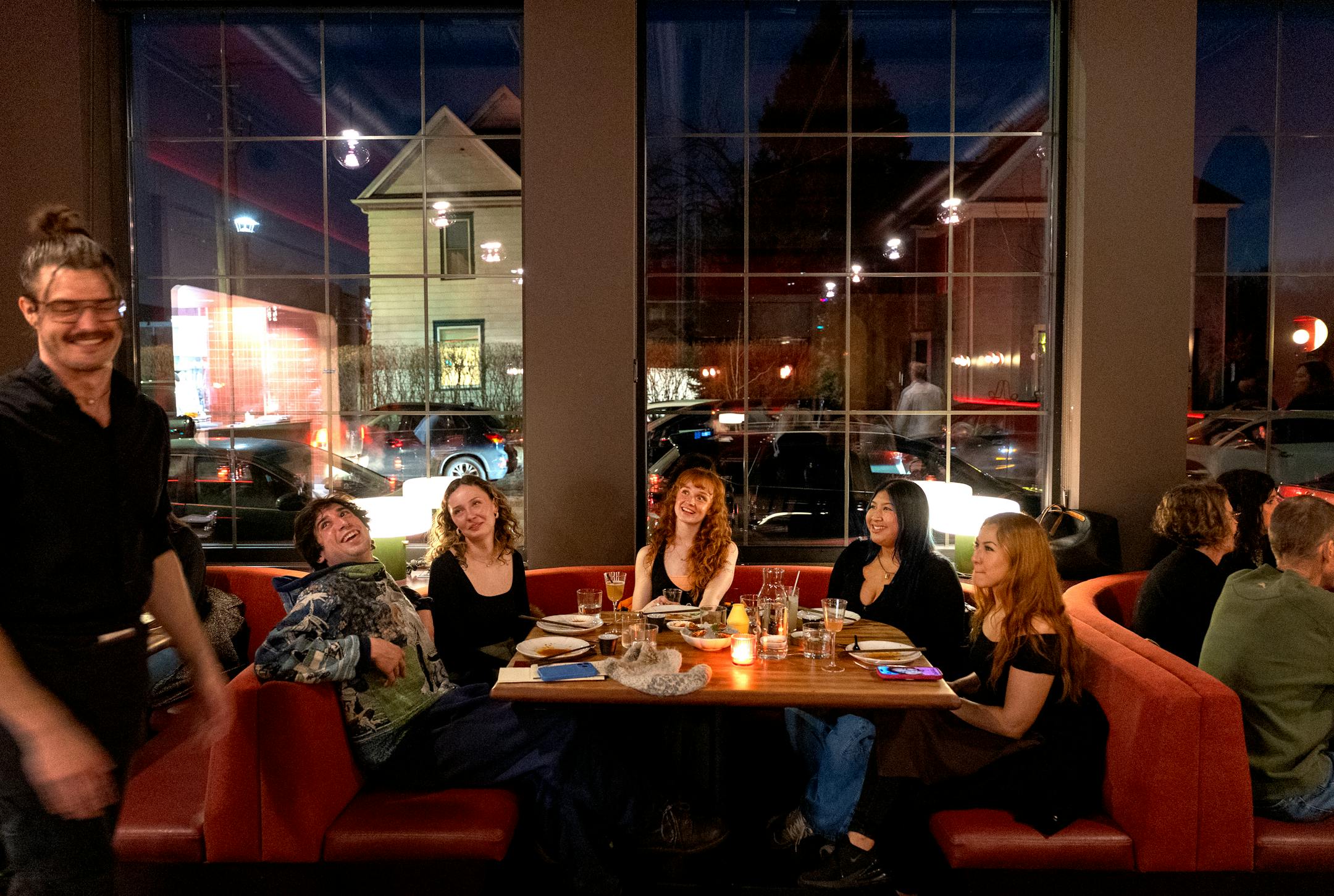With moody red lighting, textured tiles, curvy deep-set booths, groovy midcentury lamps and rich crimson walls, it’s easy to be seduced by Minari’s stunning dining room.