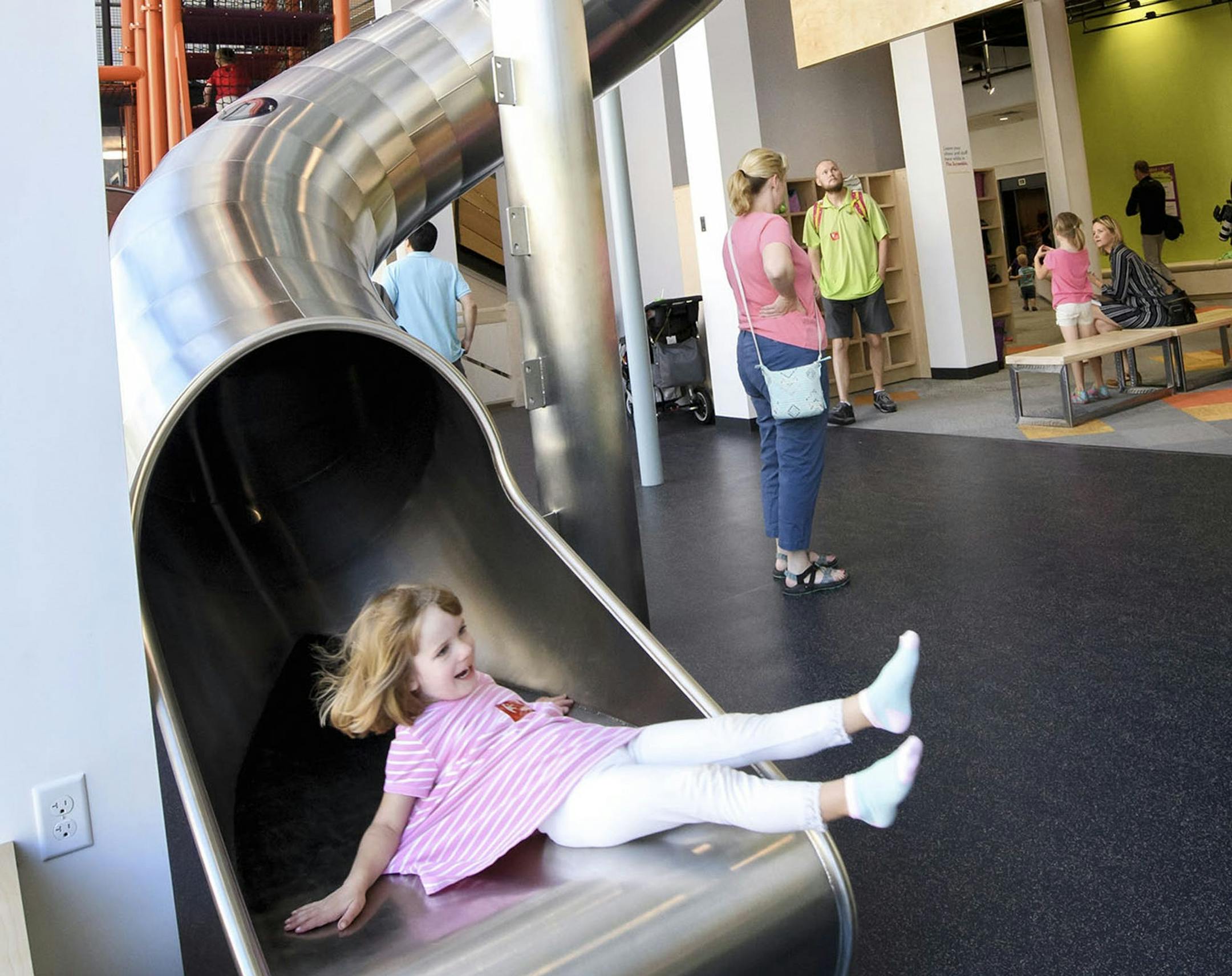Kids scamper up the new four-story climbing tower and fly down its chute, they spray water and blow bubbles and launch pingpong balls into the air, they jump and laugh and learn.