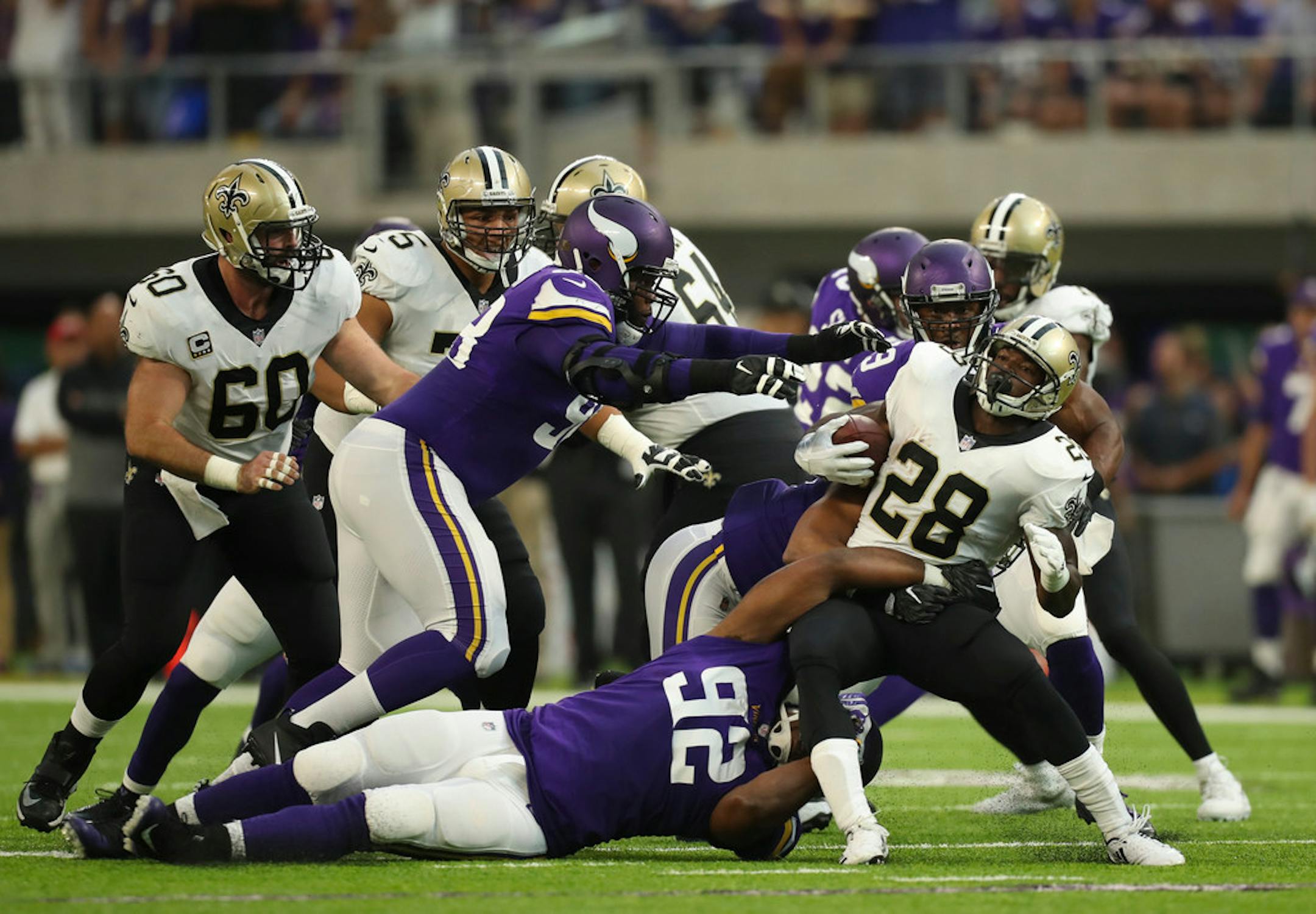 These days, Peterson is much more likely to take it for little or no gain. On Monday against the Vikings, he had six carries for 18 yards — nine on his first carry, nine more on his final five carries. The time share in the Saints backfield was almost comically equal. Mark Ingram, a 1,000-yard rusher last season, had six carries for 17 yards. Rookie Alvin Kamara had seven carries for 18 yards.