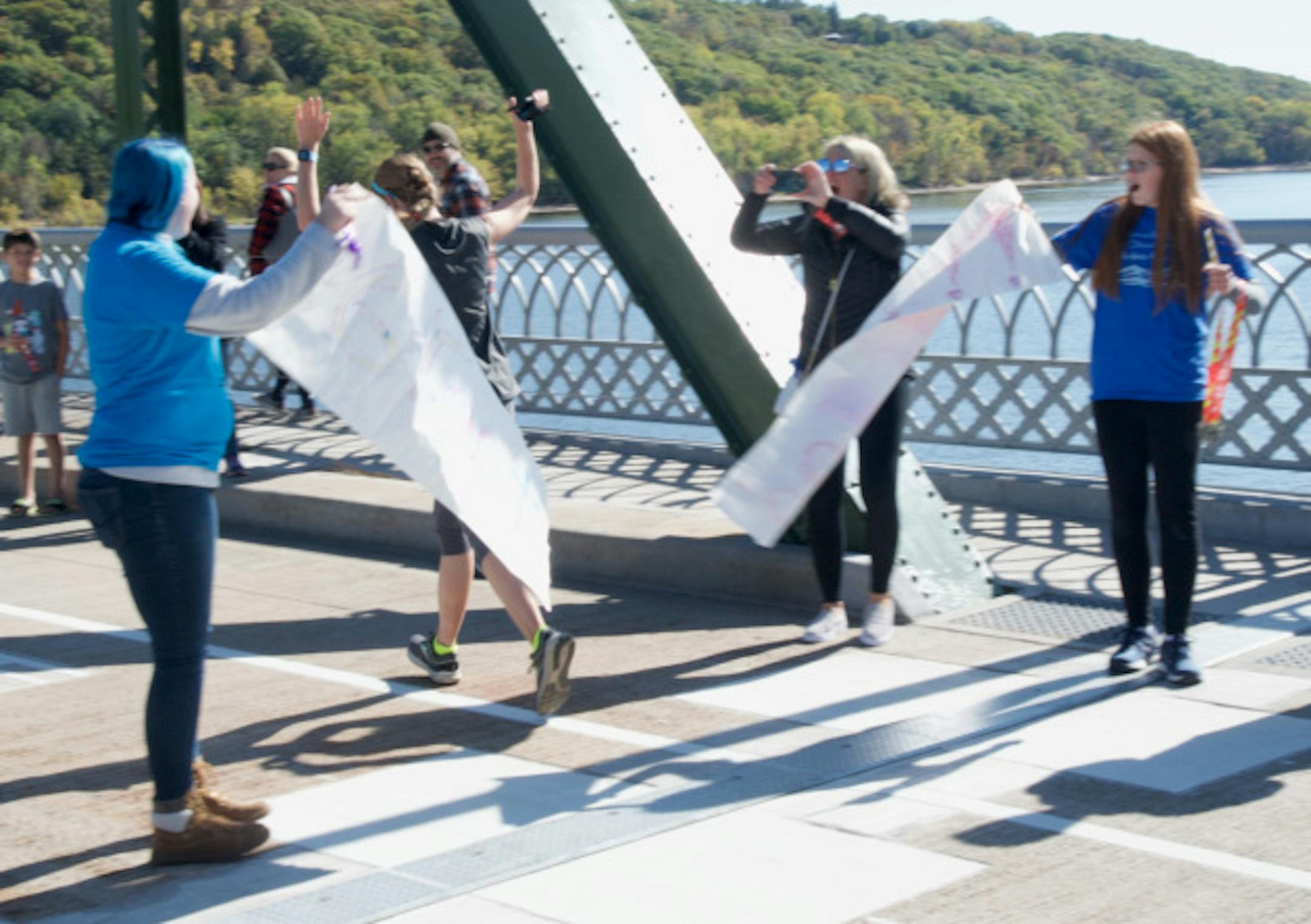 The day could not have been better for a slow but steady run from Minneapolis to St. Paul. The sun was shining, there was no wind, and the temperature was perfect. I noticed two other runners lining up close to where the start line is on 6th Street to begin their run. A third man gave the start commands and off the runners went. The man walked over and asked if we would like him to start our race. The man acknowledged that he was with the TCM and has worked the start each year. He decided to come down to the start to continue the tradition and see if anyone needed a starter. After singing a very abbreviated first verse of The Star-Spangled Banner, we were given the start commands and off we went. I was accompanied by friends and family throughout the race. My wife, daughters, and son-in-law were at their usual spot on the corner of Hamline and Summit where we stopped for elbow bumps and pictures.