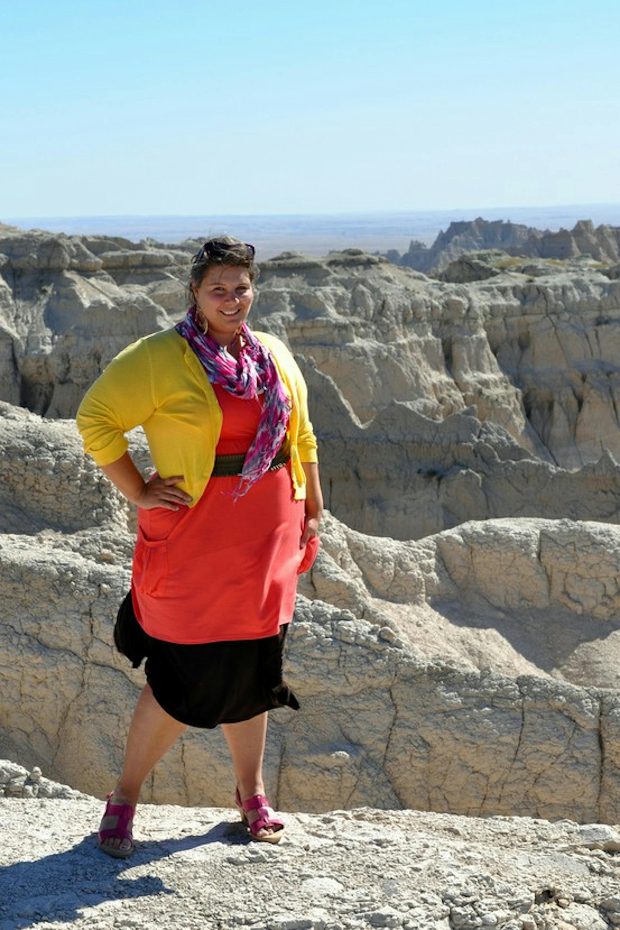 This is a photo of Vanessa from Big Girl, Small Budget, Tiny Town. She is wearing a kick-ass outfit with some bold colors and fun proportions. Vanessa and I have different shapes, sizes, budgets, proportions, and shopping resources, but when I look at this photo of her, it inspires me. It makes me want to wear yellow and orange with a pink-printed scarf. It makes me want to try a tunic over a midi. It makes me want to do a short layer over two longer layers. And yes, it makes me want to visit the Badlands, but that's not the point! The point is that, despite all of our differences, this image of Vanessa's from back in October has sparked my imagination and prompted me to think of ways I can interpret her look for myself.