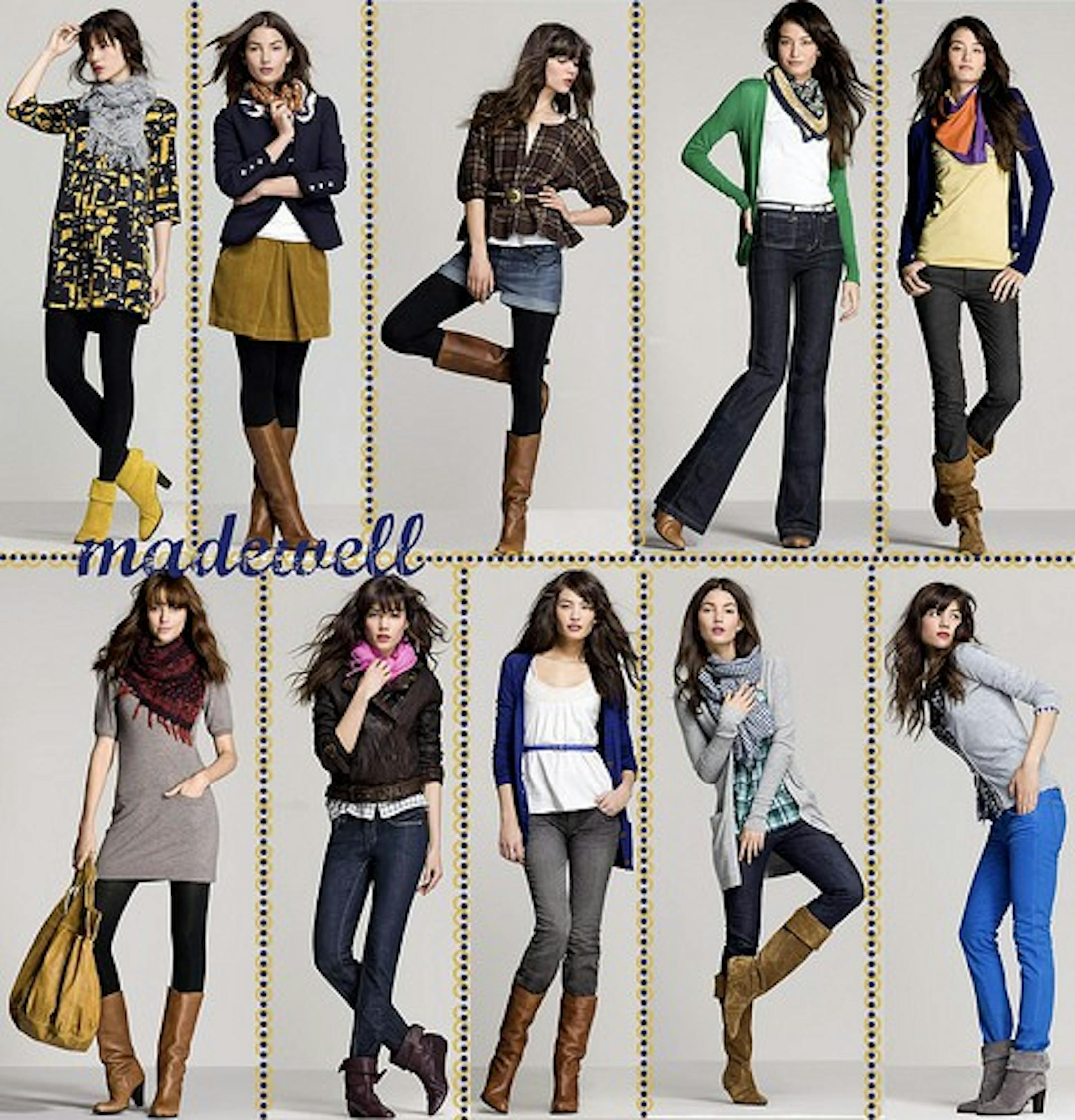This is a page from a Madewell catalog showing 10 looks. I don't own any items from Madewell and feel like much of their merchandise is a bit overpriced. But many of these looks appeal to my personal aesthetic. The women in this spread have different shapes, sizes, budgets, proportions, and shopping resources than I do, but when I look at these images, they inspire me. Even though I have absolutely no intention of buying any of the items showcased. This catalog page makes me want to swap out those bright blue jeans for my bright red ones, and pair them with a gray cardi and boots. It makes me want to wear my black opaques with rich brown boots all winter long. It makes me curious about tying a fringed scarf around my neck, cowboy style. And yes, it makes me think I probably need a pair of bright yellow ankle booties, but that's not the point! The point is despite the fact that I don't own these specific items, this image has sparked my imagination and prompted me to think of ways I can interpret these looks for myself.