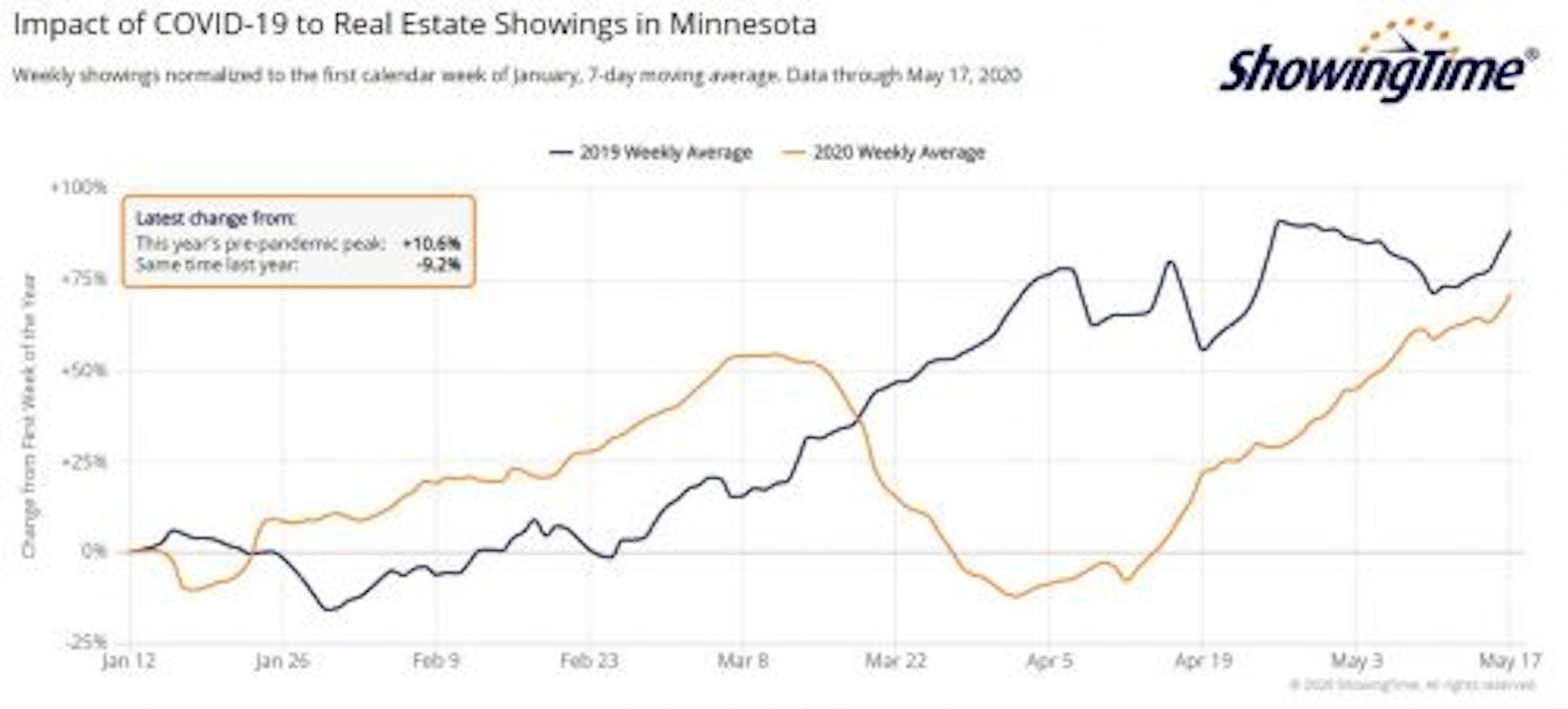 The real estate market took a big dip in April, but things seem to be close to normal again, as least as far as market activity goes. The graph below shows showings in Minnesota, comparing this year to last year.