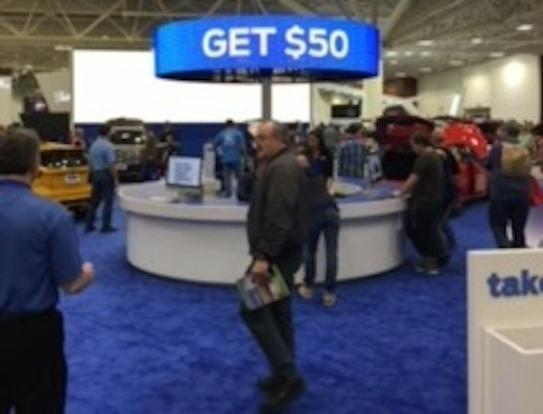 To sign up go to the manufacturer's area on the show floor at the Minneapolis Convention Center. Look for the info desk that each of the manufacturers has in its area or a rep holding a computer tablet. Say that you'd like to sign up for the test drive incentive. The rep will input some of your personal info on the tablet such as name, address, vehicle you're interested in driving, and give you a postcard with a code.