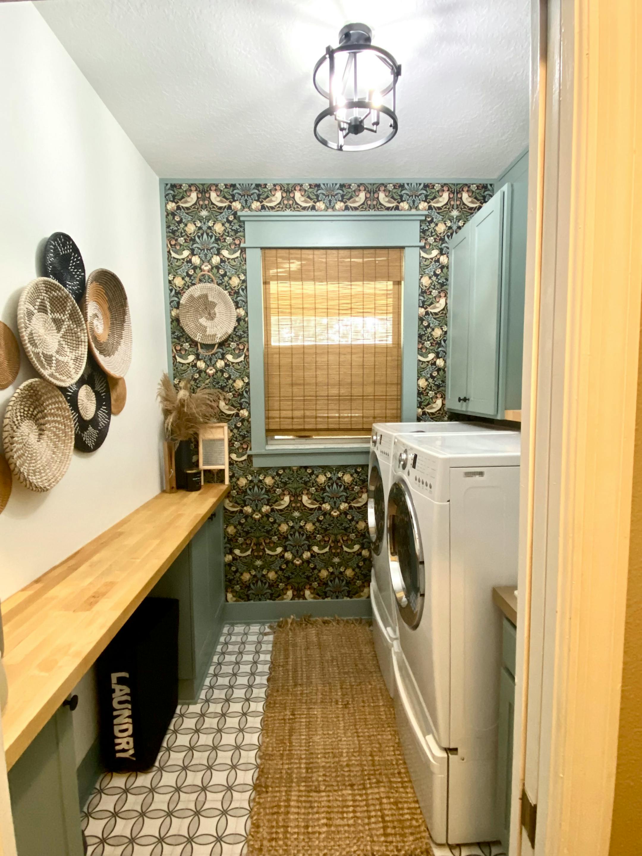 Among her biggest scores for the laundry room: tiles on clearance at Lowe's for 7 cents apiece, and cabinetry from a liquidation warehouse. The priciest item turned out to be a slab of butcher block for $270, which the couple used to make a folding station. They chose NextWall peel-and-stick wallpaper in a dark-hued garden print for an accent wall. Butler then took a swatch of it to Lowe's where the staff helped her pick matching blue paint for the cabinetry and trim. To improve the lighting, they replaced a fluorescent tube light with a ceiling fixture and sconce from Amazon. Decorative wall baskets were the finishing touch.