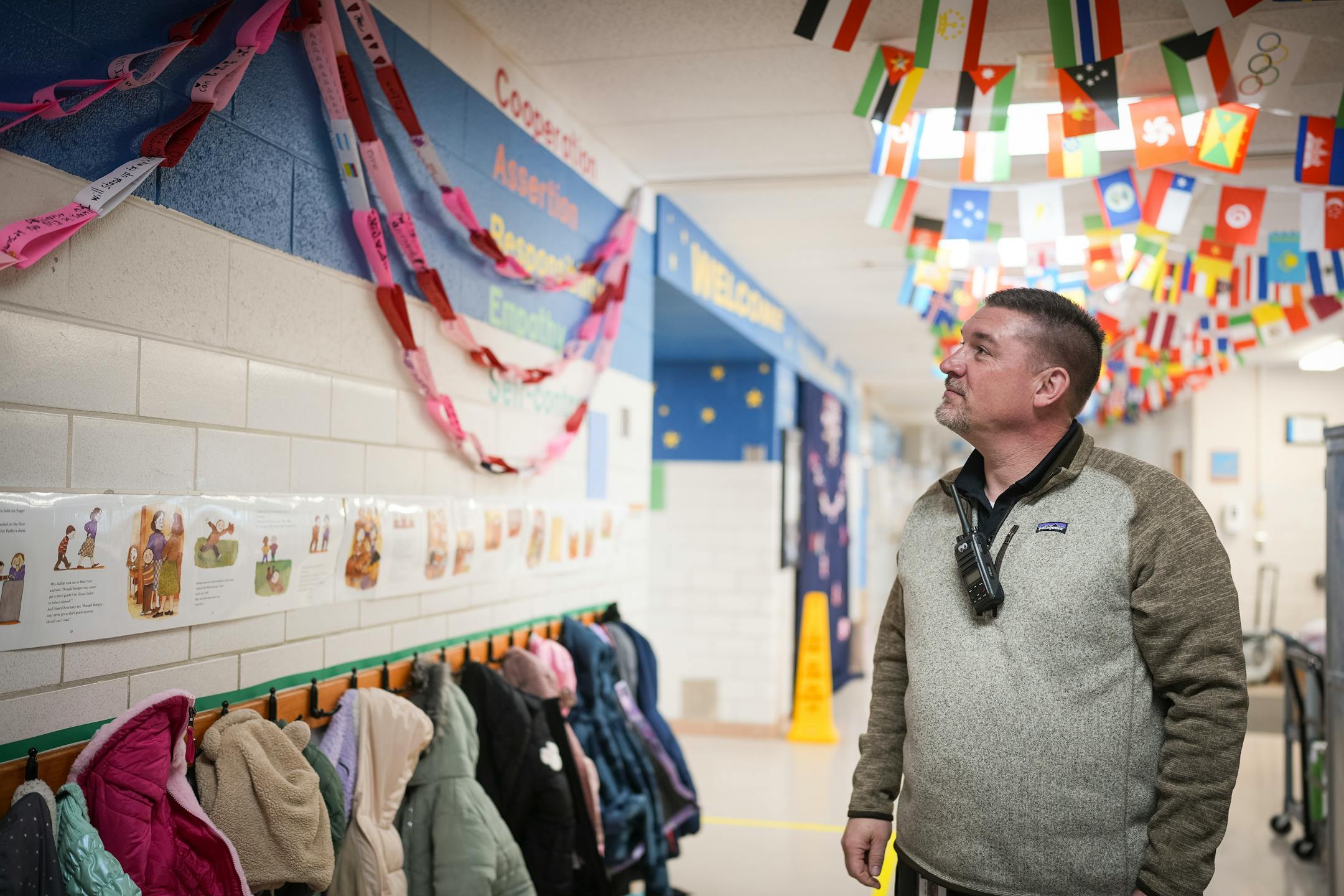 Valley View Elementary principal Jason Kuhlman looks at artwork made by students for Liam Conejo Ramos in Columbia Heights on Feb. 19. (Leila Navidi/The Minnesota Star Tribune)