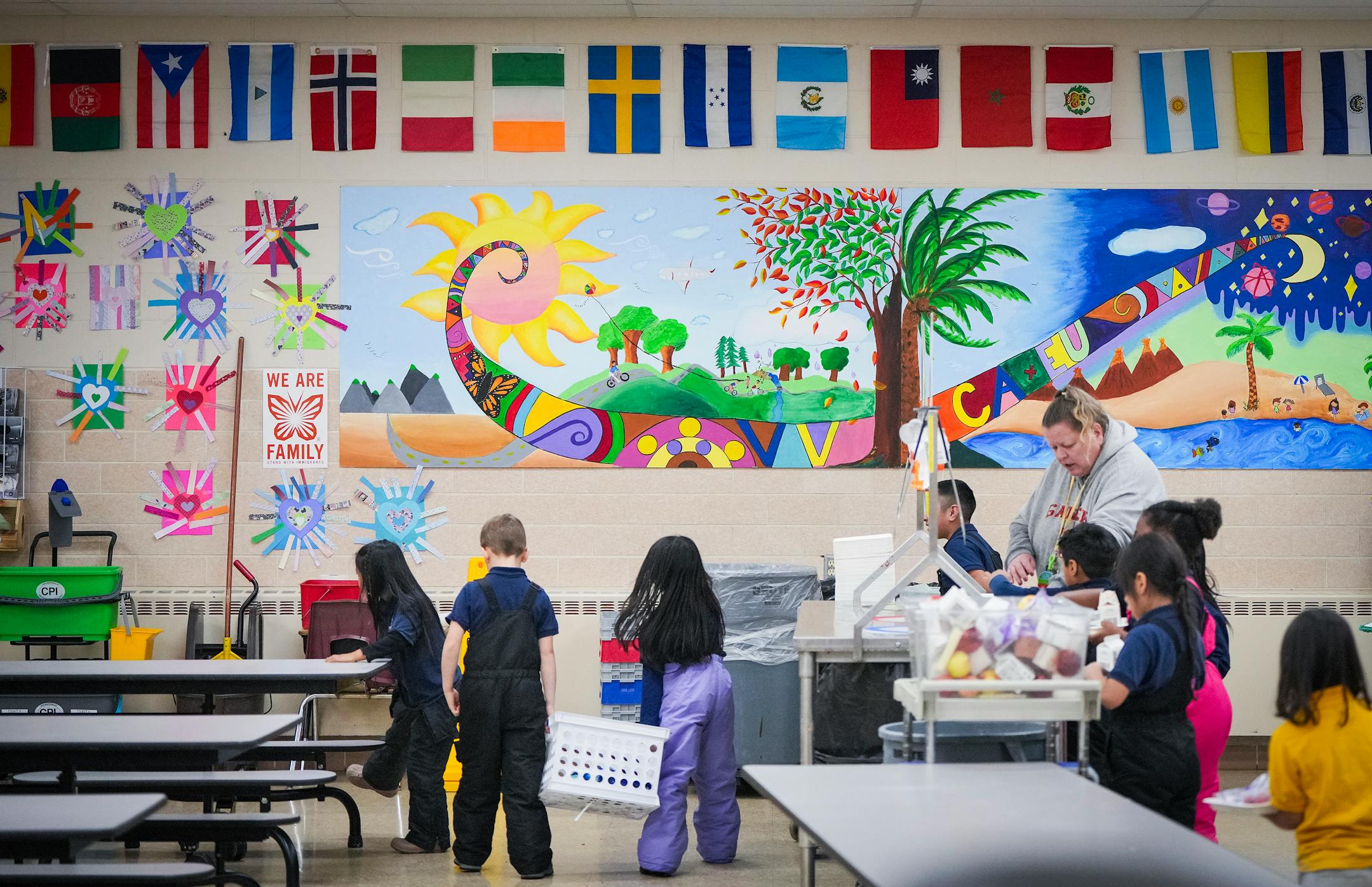 Flags representing the countries from which students and their families hail are displayed in the lunchroom at Valley View Elementary School in Columbia Heights on Feb. 19. (Leila Navidi/The Minnesota Star Tribune)