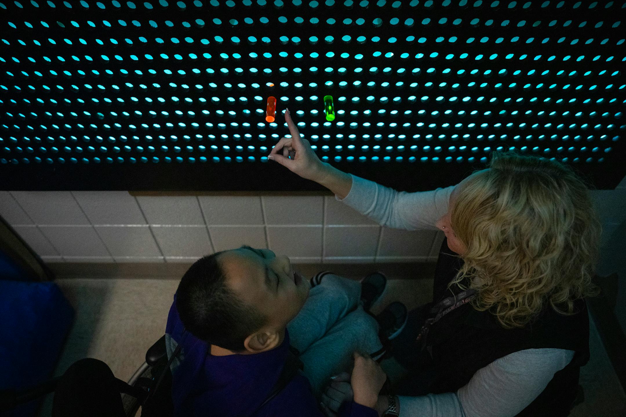 Yang, who uses a wheelchair, is nonverbal and has been working on his fine motor skills. He also has been learning how to gauge distance and getting lessons in functional communication through the special education department at North View. When he returned to school after MEA weekend, Smith had a new tool for his lessons: an enormous Lite Brite-style board mounted on the wall in the special education classroom — built by other students.