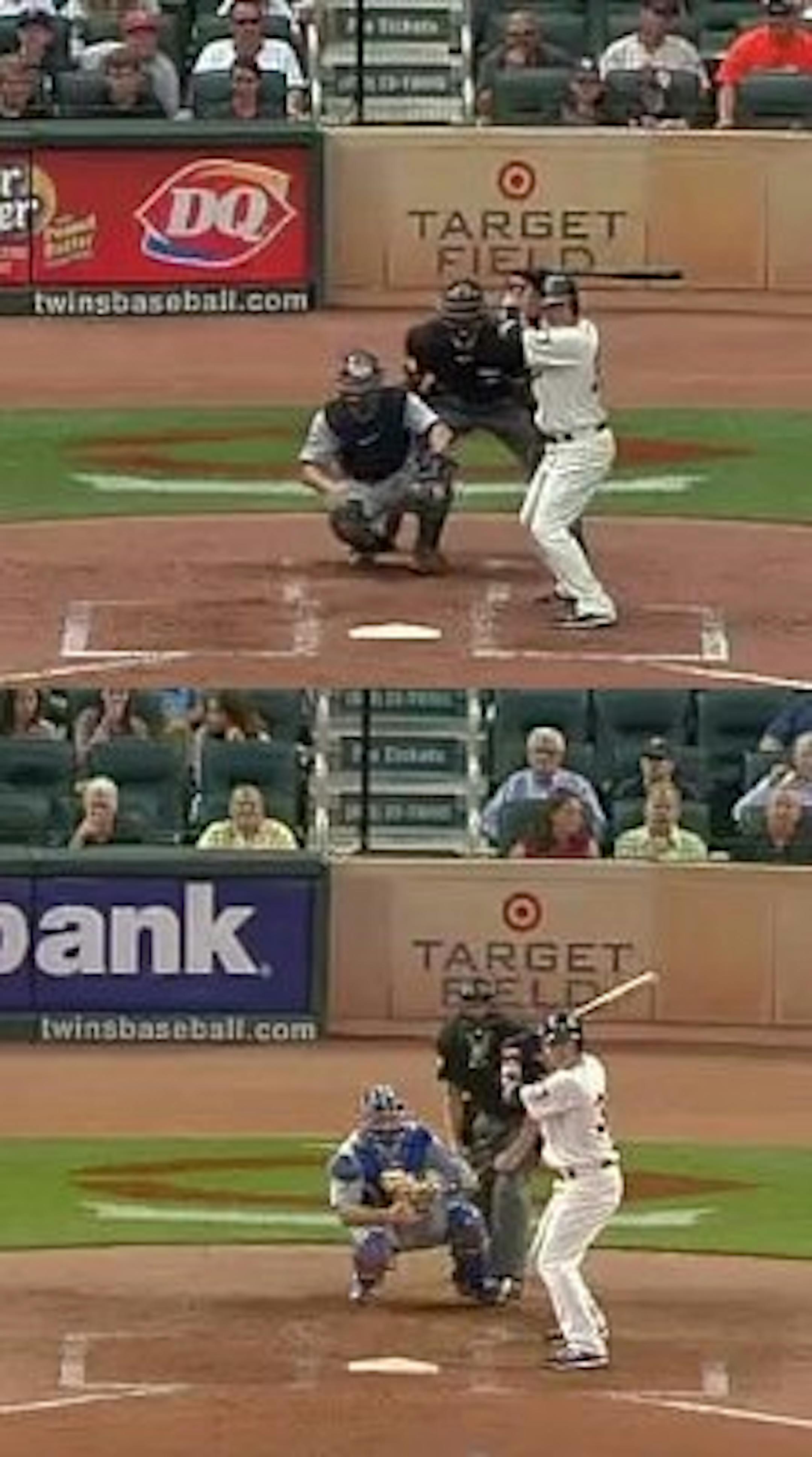 Some regular readers may recall that this is the same adjustment that Delmon Young made back in June. Heading into the early June Texas series in which he made his changes, Young was hitting just .219/.250/.271 with six extra base hits in 164 plate appearances. From that point forward until he was traded to Detroit, Young hit .313/.360/.447 with 14 extra base hits in 161 plate appearances so you can see how the tinkering helped tap back into Young's power vein. Another component of this retooling is that Hughes has reduced his weight transfer on to his back leg. In the first clip from June we find Hughes making a significant shift from his front leg to his back one when loading up for his swing. Because of this, you see that his head changes planes: