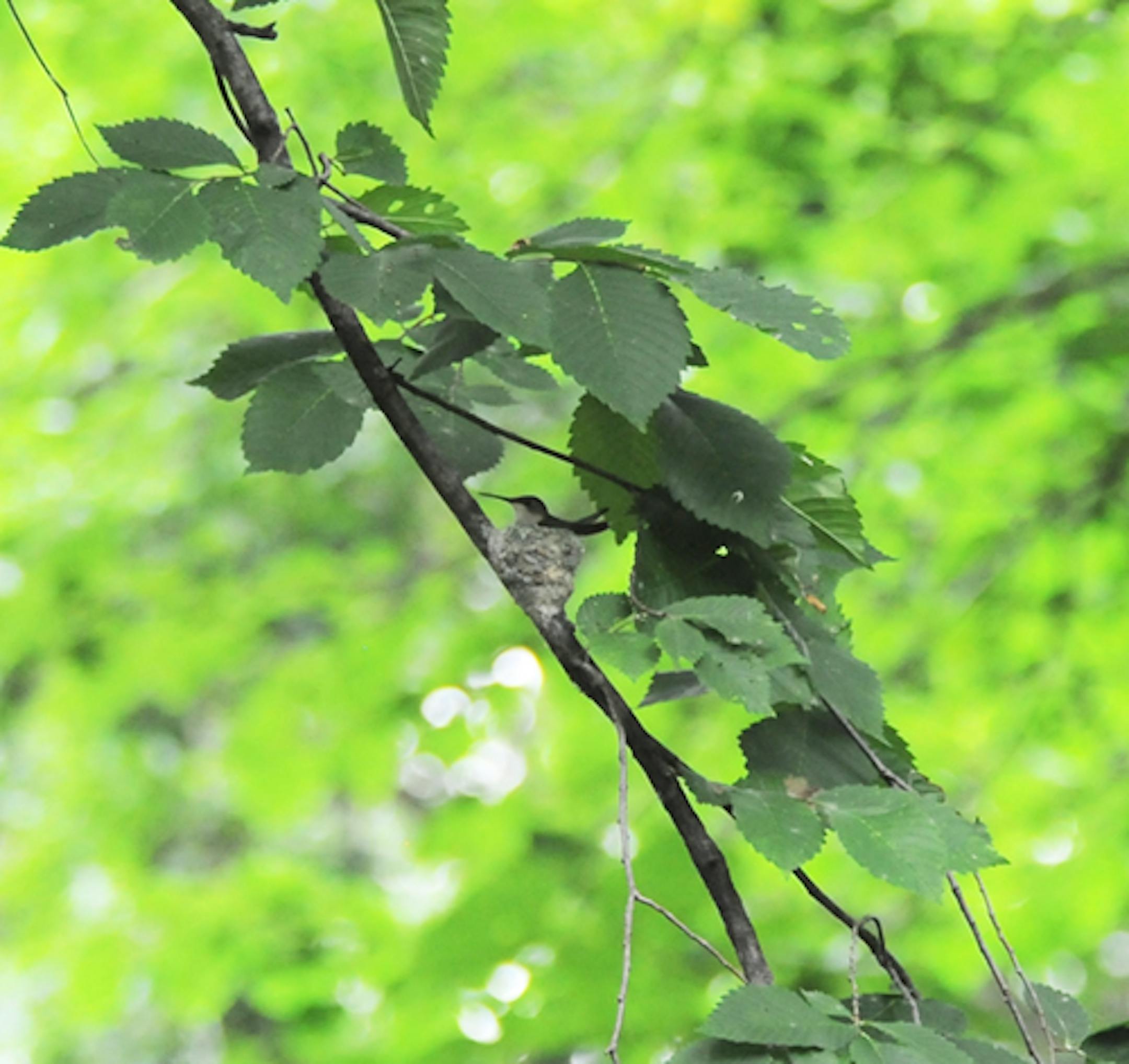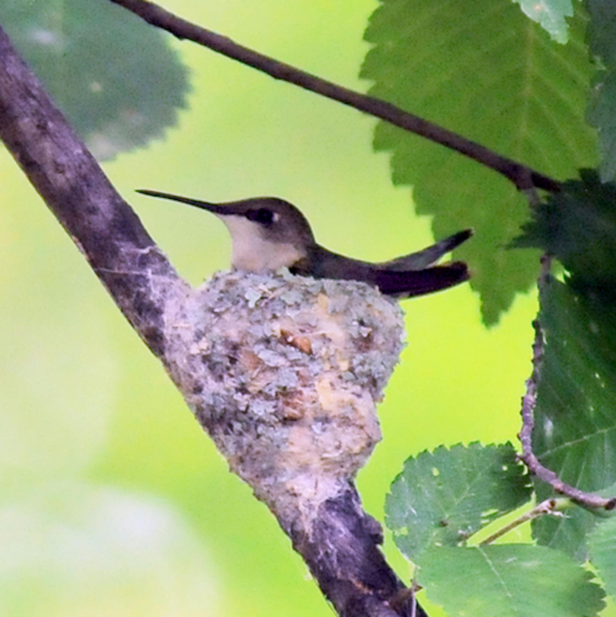 The nest of a Ruby-throated Hummingbird is being watched at a park location in St. Louis Park. Eggs are are close to hatching, although exactly when is unknown. Incubation takes about 16 days, young birds leaving the nest about 19 days after hatching. The nest is made of plant material and down held trightly together with spider web. It is covered on the outside with flakes of lichen. The female bird, working alone, builds the nest in about five days.