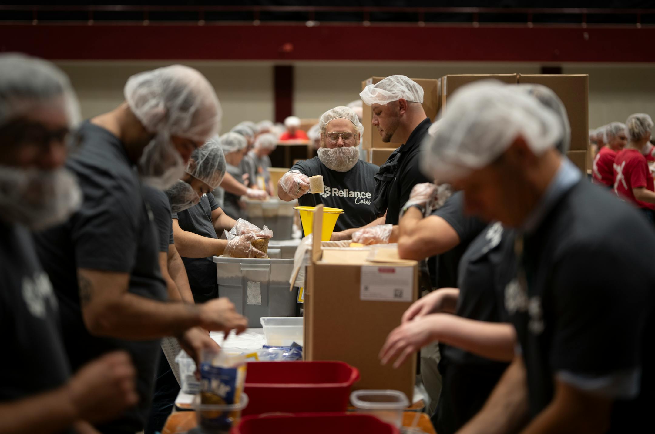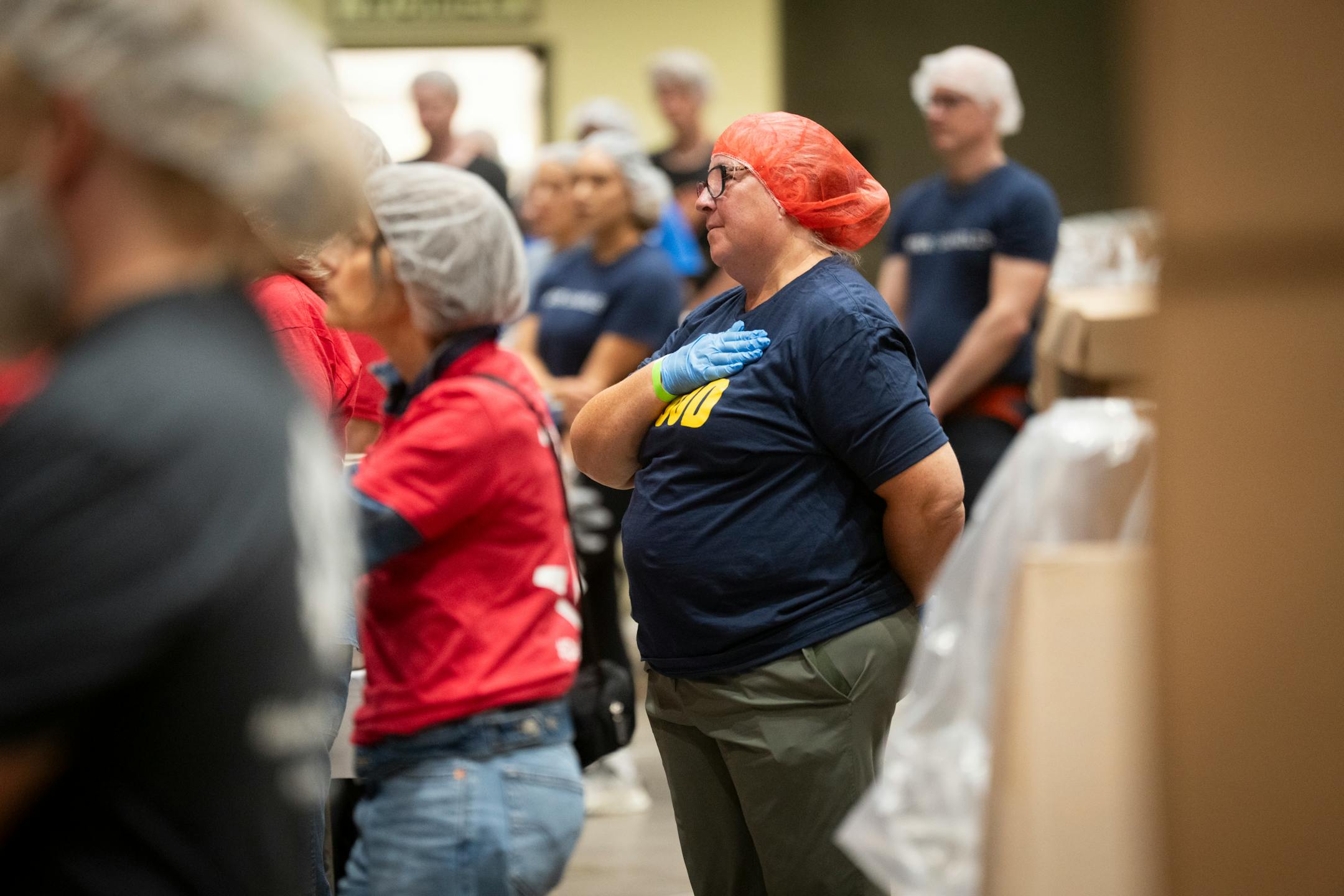 After Lanners’ countdown, volunteers donned gloves to begin packaging around 190,000 meals. The pitter-patter of macaroni shells pouring into measuring cups drowned the screech of packing tape and rustles from cardboard boxes. White hair nets covered attendees’ heads as they bobbed to “September” by Earth Wind & Fire and Prince’s “Little Red Corvette.”