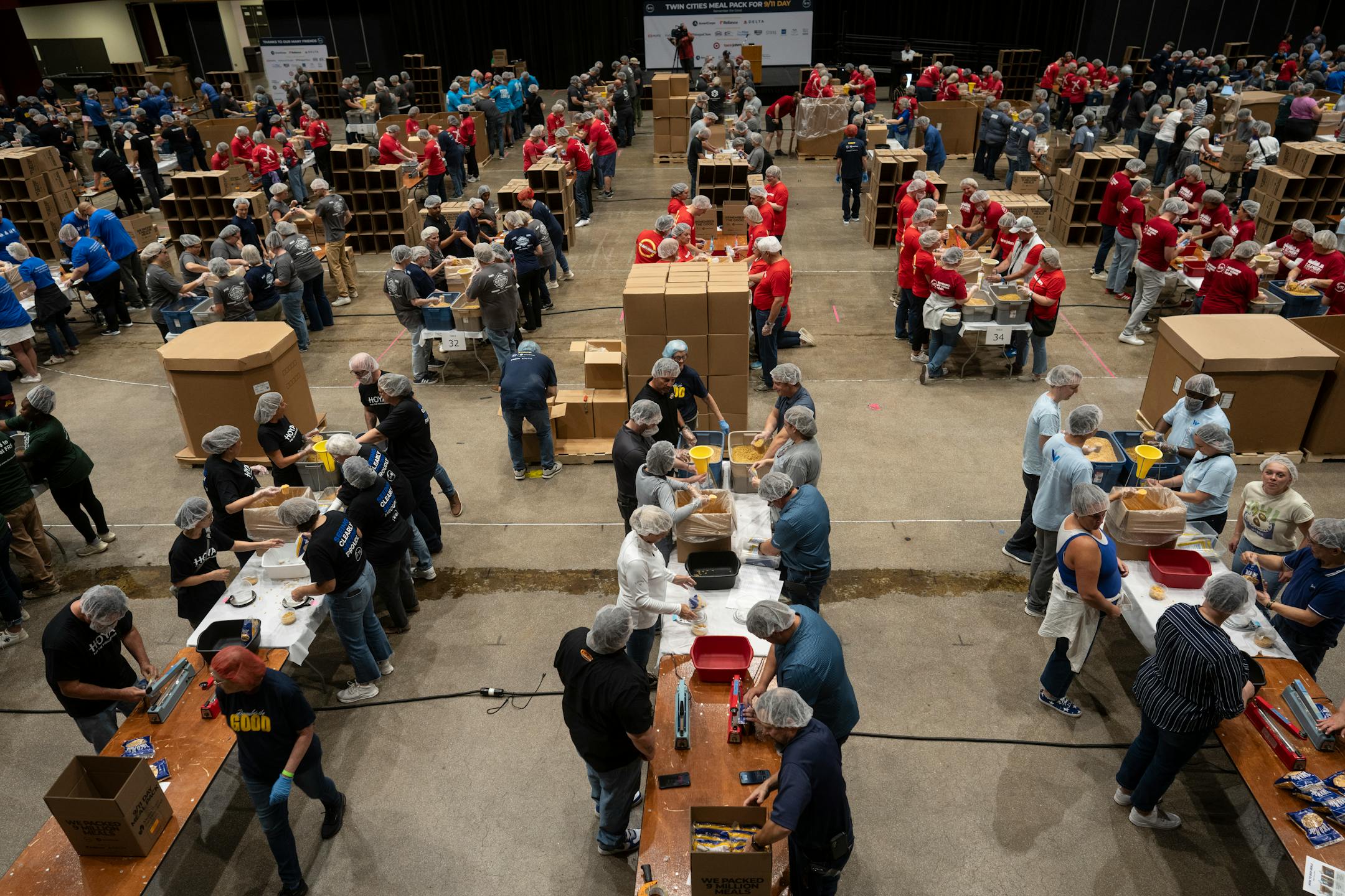 Emcee Chad Lanners welcomed more than 500 volunteers to St. Paul’s RiverCentre, thanking them for helping to turn a day of “sadness and loss” into “one of the most loved and powerful positive impact days since 2001.” It was one of 24 volunteer projects across the nation organized by the nonprofit 9/11 Day, which assembles tens of thousands across the nation to package more than 9 million meals for needy Americans.
