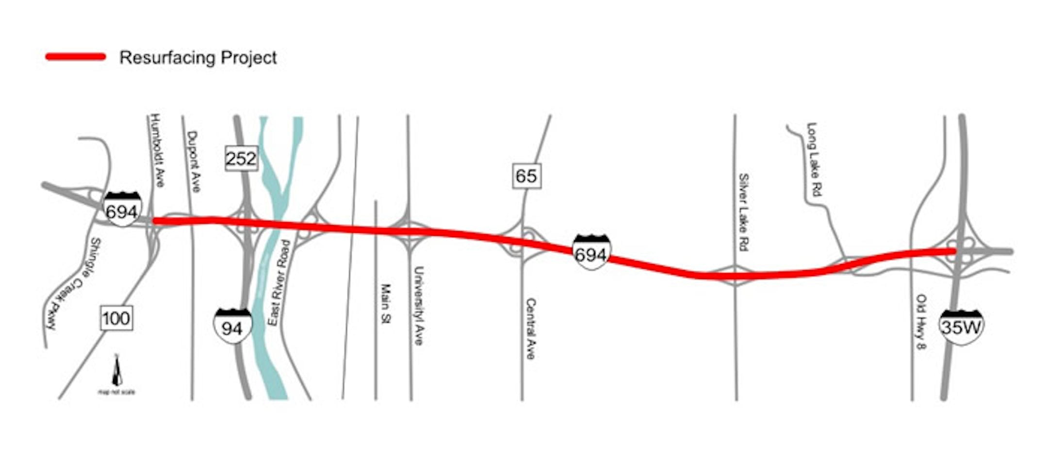 From June through October, the Minnesota Department of Transportation will give the 5 1/2-mile stretch between Interstate 35W in Arden Hills to Humboldt Avenue in Brooklyn Center a $21 million makeover that includes concrete repair, resurfacing and replacing three bridge decks. The project will reduce the freeway to two lanes in each direction during the day and to a single lane overnight. On three weekends, the entire intersection of I-35W and I-694 will be shut down.
