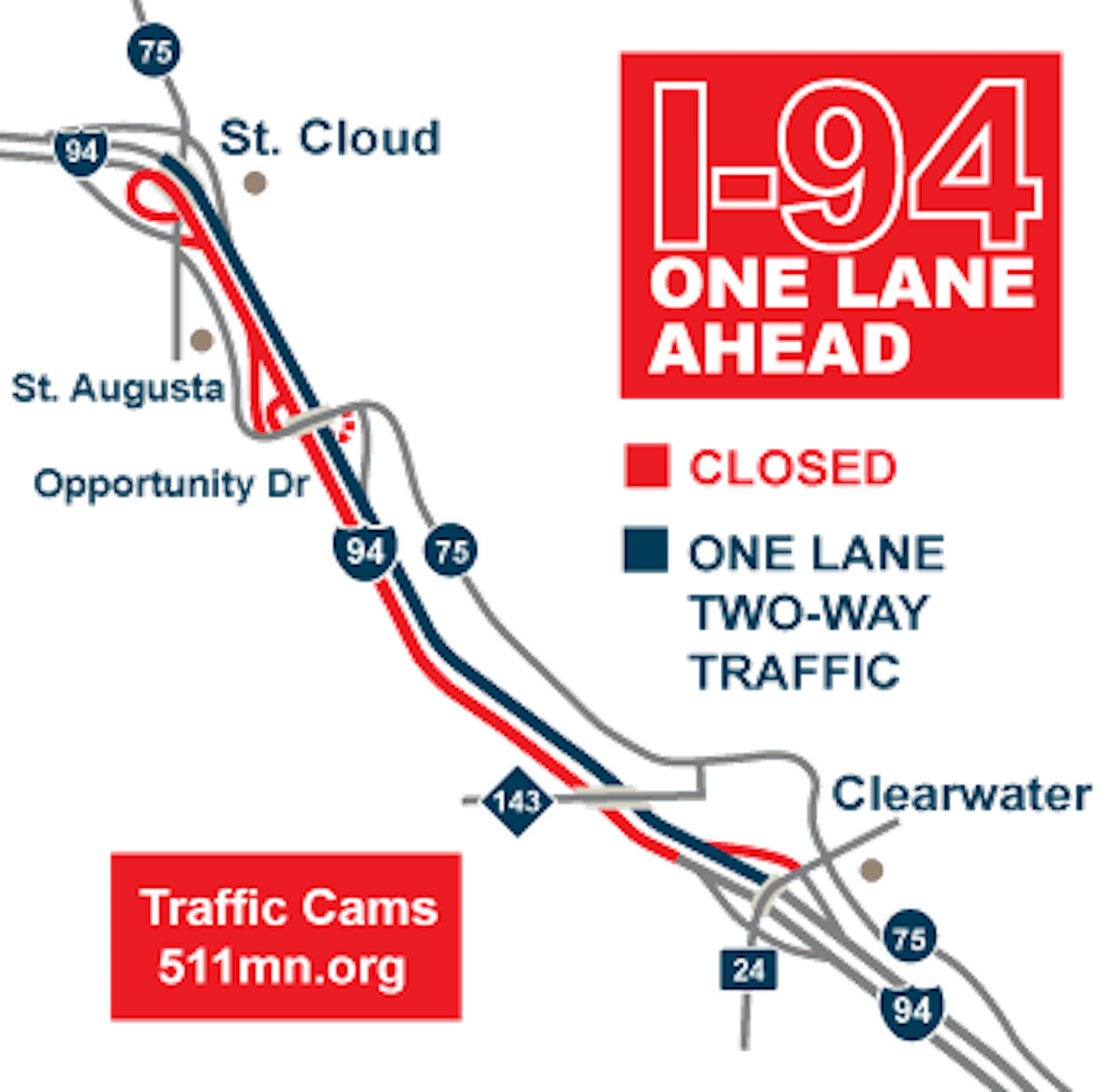 Lane restrictions between County Road 75 in St. Cloud and Hwy. 24 in Clearwater will be in place 24 hours a day except on Memorial Day weekend, May 24-27, and from July 2-6 for Independence Day weekend.