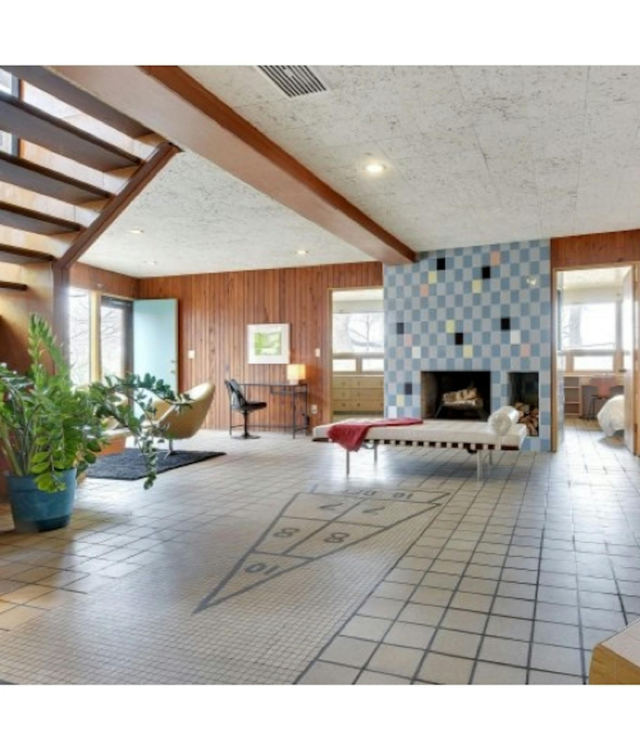 The downside of living in a house lined with tile would be the acoustics, right? It's possible to imagine a sound ricocheting through the house for several minutes until it finally gets smothered by a quilt in the spare room. On the other hand, this is an amazing piece of work: the Tile King House, now for sale in Minneapolis. Go look. Almost 70 pictures of an unspoiled midcentury house that could have come straight from a Better Homes & Garden spread. Here's the lower-level room for rumpusing: