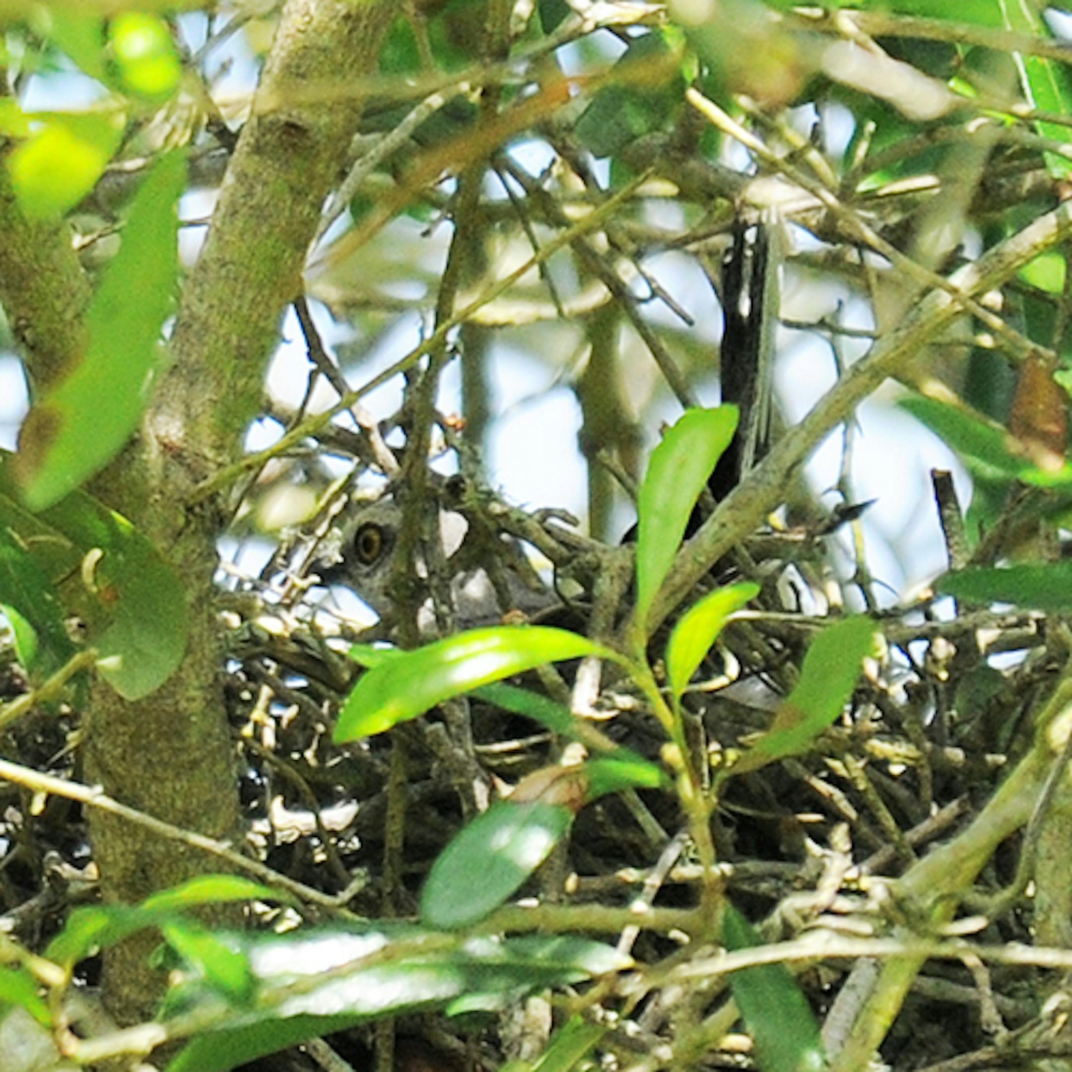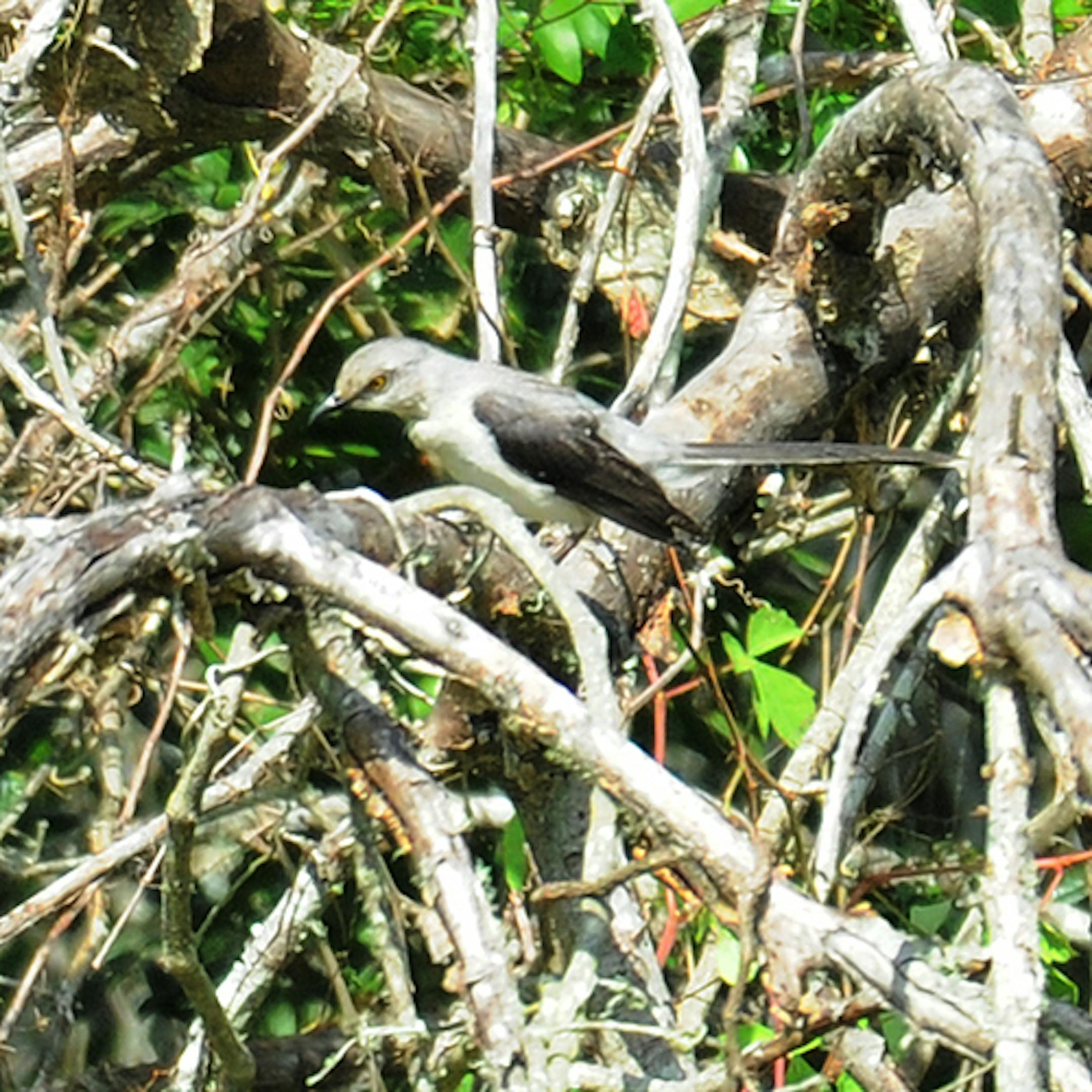 Oooops. Forgot about seeing a possible first North-American-record bird species in Texas. I wrote a couple of days ago about my recent Texas trip, focusing on its long travel aspects, long in both time and distance. I chose as highlights bats and a lovely old lady. The blood pooling in my injured leg obviously drained from my brain. On our last day in Texas, our small tour group drove to Sabine Woods, a birding location on the Texas-Louisiana border maintained by the Texas Ornithological Society. We had learned that a Tropical Mockingbird was being seen there. This is a species never before recorded in North America. It was easy to find: other birders were present to offer directions, plus the mocker seems to be nesting with a native Northern Mockingbird. The nest could be seen; we just stood and waited for the bird to appear. The Tropical Mockingbird was discovered at Sabine on April 18. It is resident from southern Mexico south to northern Brazil and on some Caribbean islands. It is kept as a cage bird (mostly in its native locations), so will carefully be reviewed as to its legitimate wild status. An escaped or released cage bird will not make the record books. But, its presence on the Texas coast bodes strongly for its legitimacy. The bird's home range is but a flight across the gulf. Here are a couple of my photos. The bird is larger than the Northern Mockingbird, has darker wings lacking white wing bars, and has a longer, blacker tail. I now revise my previous remarks, moving this bird right up there with bats and the president of the Daughters of the Republic of Texas (her photo is here, too; she is muxh more colorful, as you can see). In the second photo, the bird is on the nest. Its head and eye are visible left center.