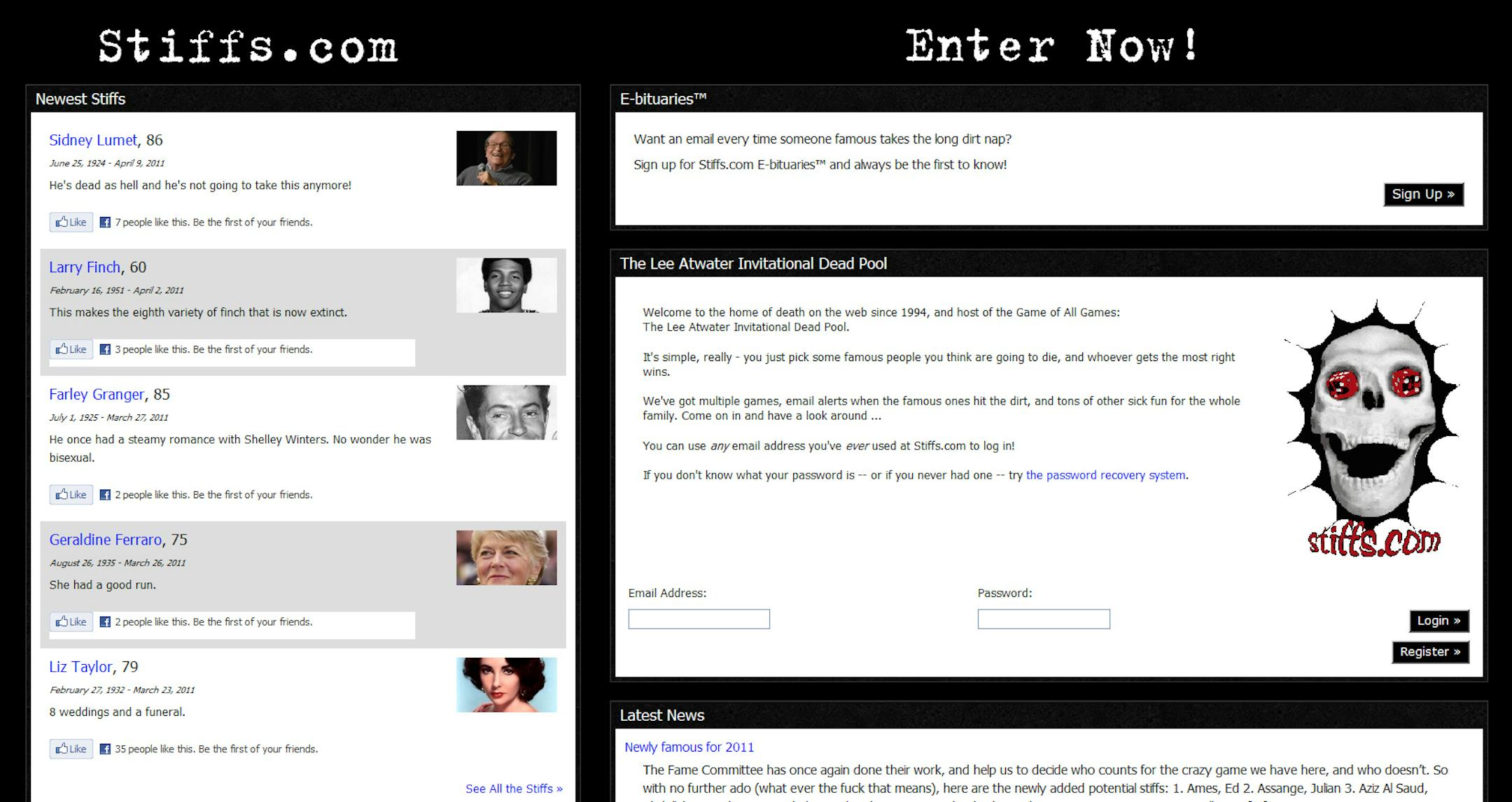 Brown's first death pool, which is free, has 48 participants. The Old Blue Eyes Memorial Celebrity Death Watch, a free death pool named after Frank Sinatra, has 146 entrants. When the contest started in 1998, there were only 12. And this year, Stiffs.com, home of the Lee Atwater Invitational Dead Pool, is one of the largest, with 1,296 entries from around the world. That's 445 more than five years ago. Each entry costs $15 and competes in a yearlong contest for a grand prize of $3,000.