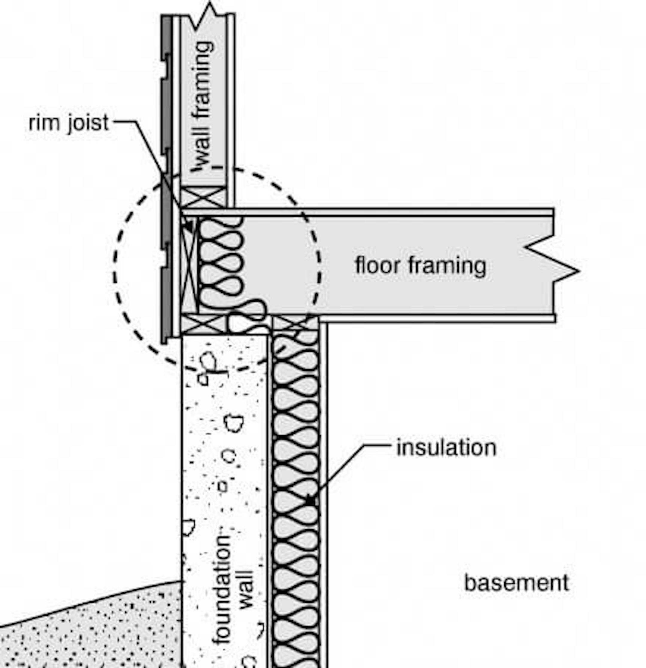 Fiberglass should never be used at rim spaces. The rim space is the area between the floors of a house; this is an area where it's nearly impossible to install a proper vapor barrier. Without a vapor barrier, condensation can occur at the rim space, creating mold growth or eventually rotting out the rim space. This is why fiberglass insulation should never be used here. On new homes, it never is. The only type of insulation that gets used on new construction homes in Minnesota is closed cell spray foam insulation; we'll come back to that in a minute.