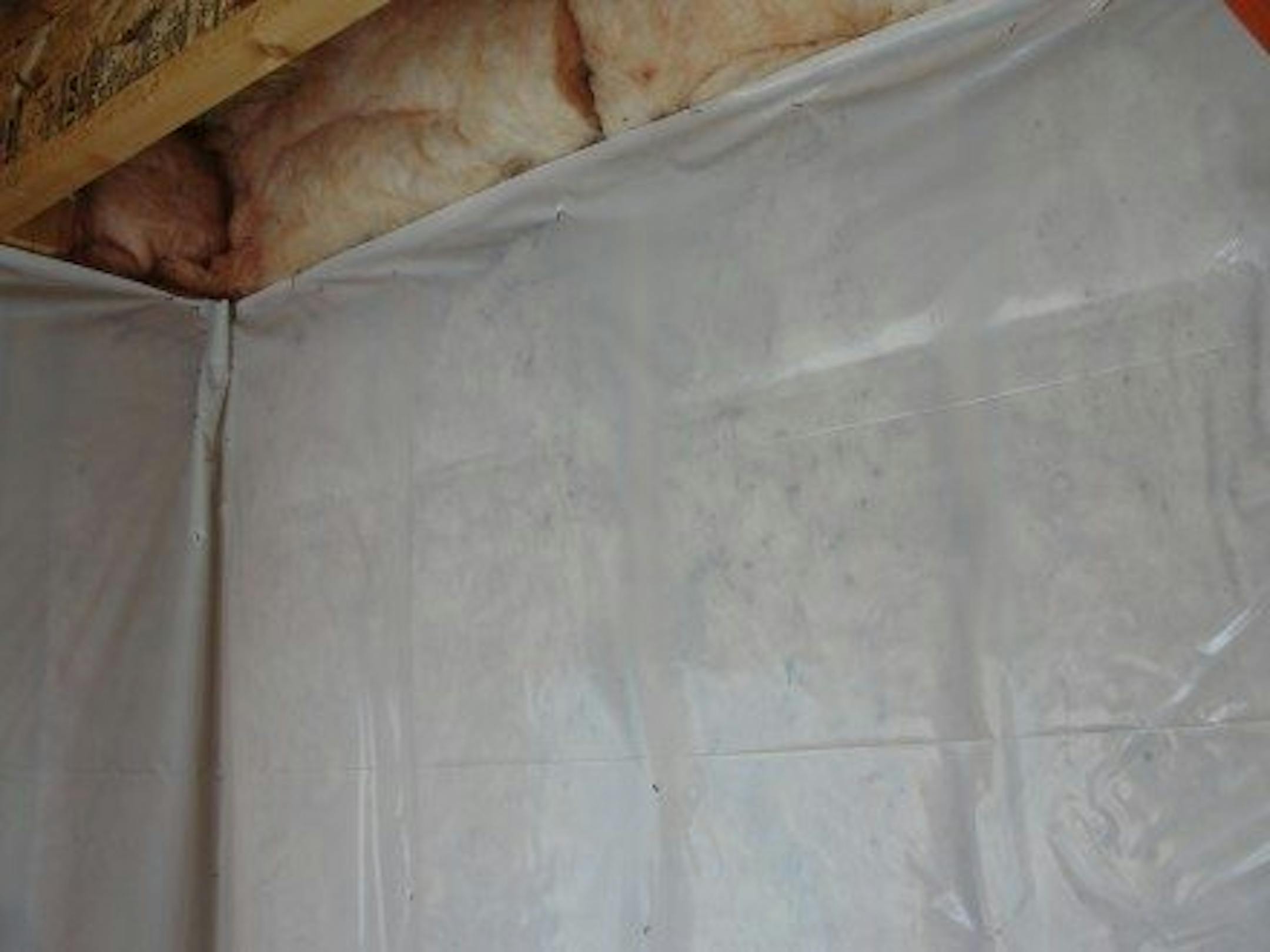In addition to having fiberglass batts for insulation, the vapor barrier in my basement was basically useless. Here's how a vapor barrier is supposed to work: to prevent air from passing through the fiberglass insulation and creating moisture problems in the wall, a vapor barrier gets installed. This consists of a thin layer of polyethylene sheeting (aka 'poly', aka 'Visqueen') that has been made airtight; that means caulked, overlapped, sealed, taped, etc. On a home built today, this will be done quite well. On a house that's thirteen years old... no way. The vapor barrier will probably be just about useless.