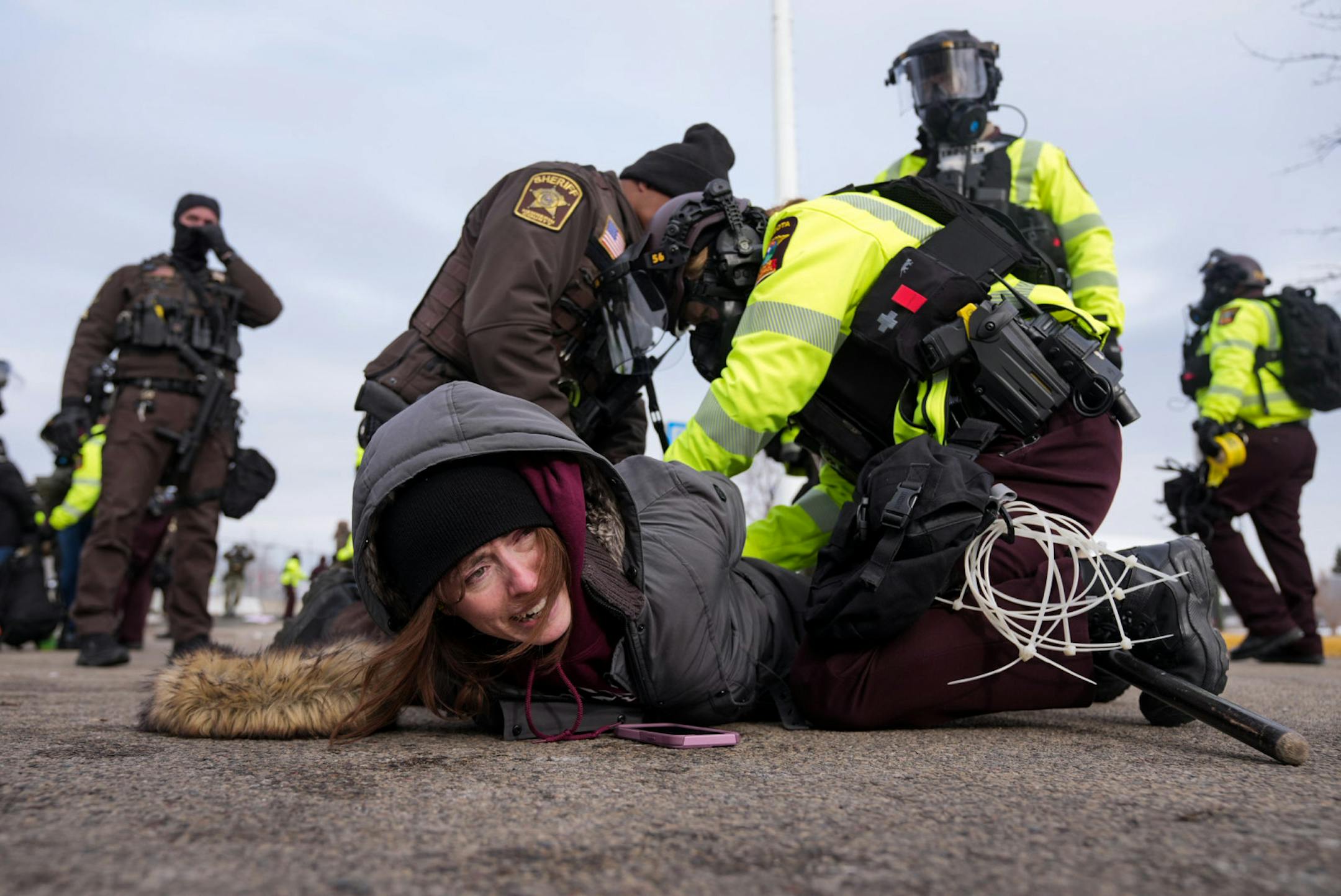 At least 40 protesters were arrested outside the Whipple Federal Building this afternoon after the crowd grew to nearly a thousand, many there to counter Jan. 6 rioter Jake Lang, who made a brief appearance. The Hennepin County Sheriff’s Office said one of its deputies was struck in the head and a windshield was smashed.