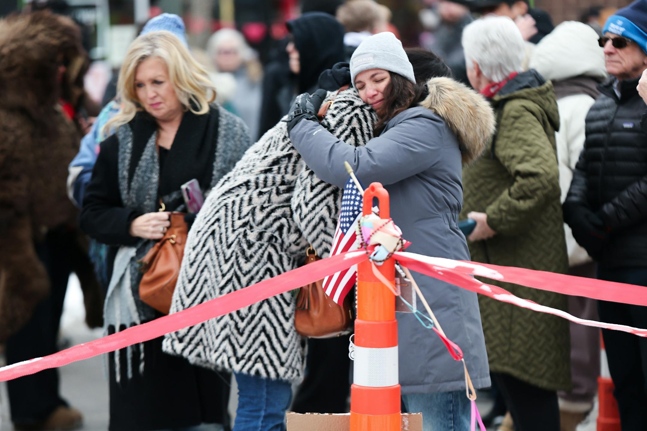 Participants hug at the Missing and Murdered Indigenous Women's rally at the scene where Alex Pretti was killed in Minneapolis on Sunday, Feb. 01. (Elizabeth Flores/The Minnesota Star Tribune)