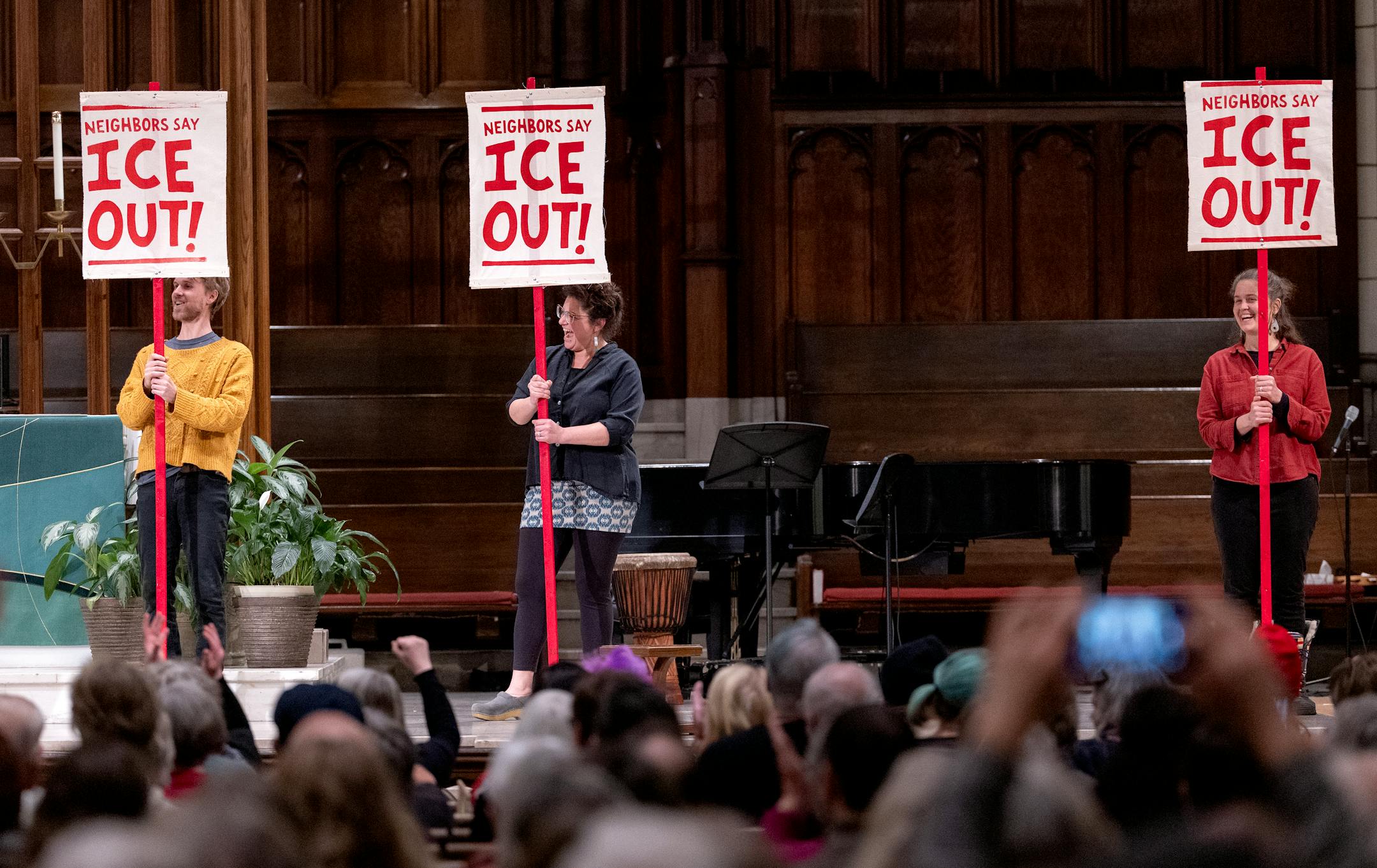 People hold "Ice Out" signs during a Singing Resistance event at Central Lutheran Church in Minneapolis on Feb. 10. Songs of solidarity and grief were sung during the event to raise funds for immigrant and refugee neighbors. (Carlos Gonzalez/The Minnesota Star Tribune)