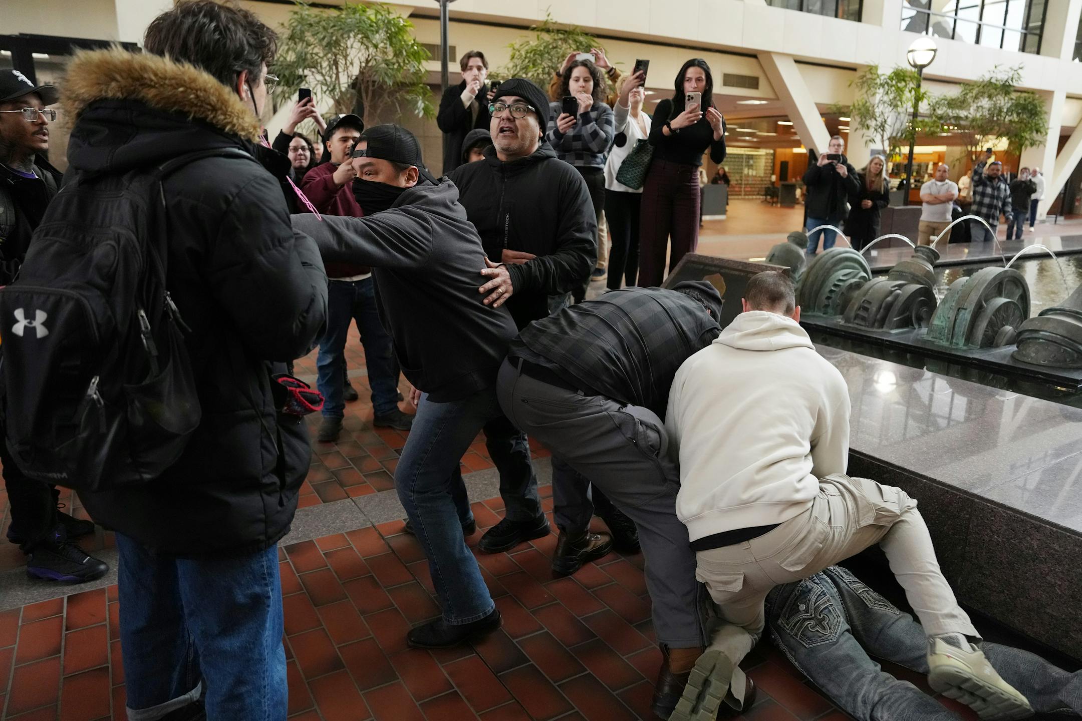 Plain-clothed federal agents tackle and arrest a man after a short foot chase in the lobby of the Hennepin County Government Center in Minneapolis on Feb. 10. (Anthony Soufflé/The Minnesota Star Tribune)