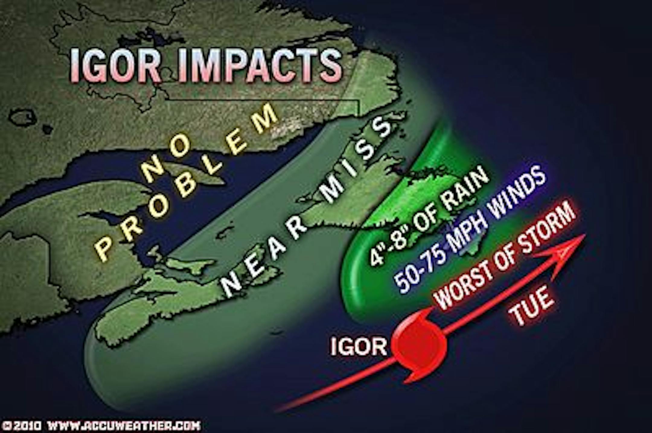 Hurricane Igor made landfall over extreme southeastern Newfoundland today withdamaging winds and flooding rain before racing northward to the Labrador Sea asa powerful oceanic storm.As of 8 a.m. EDT, Igor was located about 150 miles south of Cape Race,Newfoundland. Sweeping towards the northeast at 45 mph, Igor was still barely aCategory 1 hurricane having highest sustained winds of 75 mph.
