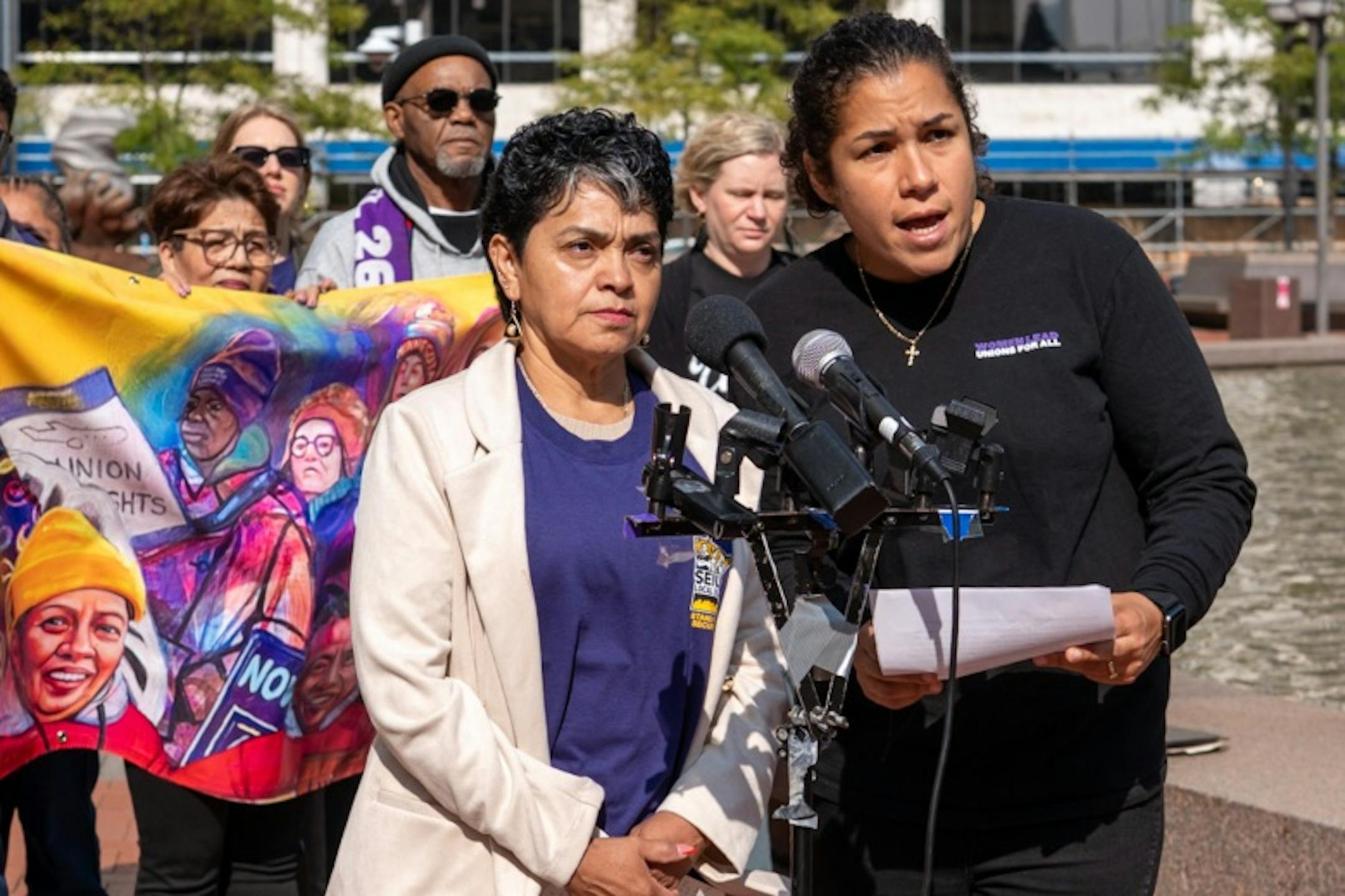 The group organized by Service Employees International Union (SEIU) Local 26 included seven janitors with a combined 180 years of experience who had recently been laid off from their jobs at the building.
