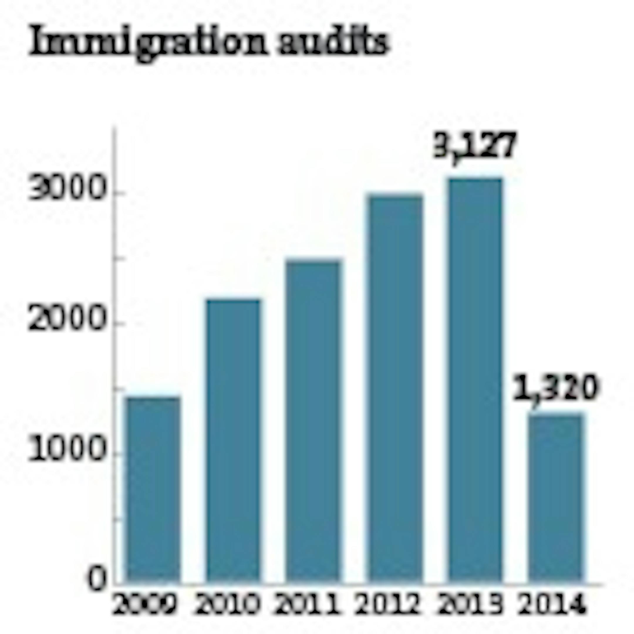 Nationally, audits of employer work eligibility paperwork went up markedly since 2009 before dipping in the most recent fiscal year. Manager convictions picked up, too. Meanwhile, the number of Minnesota-based companies signed up for the E-Verify worker screening system increased steadily.