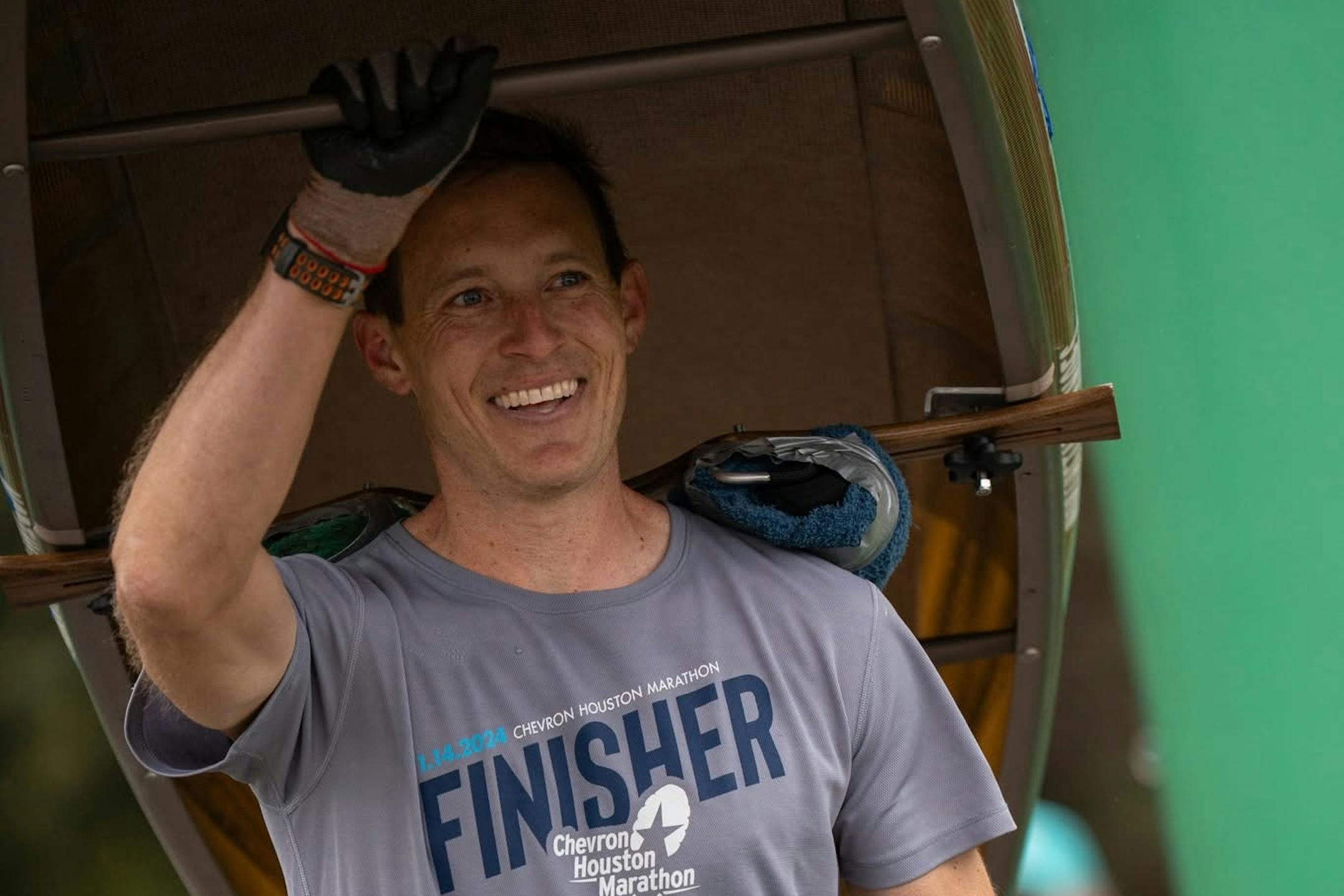Lugging a 26-pound solo Kevlar canoe, Shol completed the marathon course Sept. 20 in 3 hours, 58 minutes, 54 seconds. He appears at 1:32 in the video below.