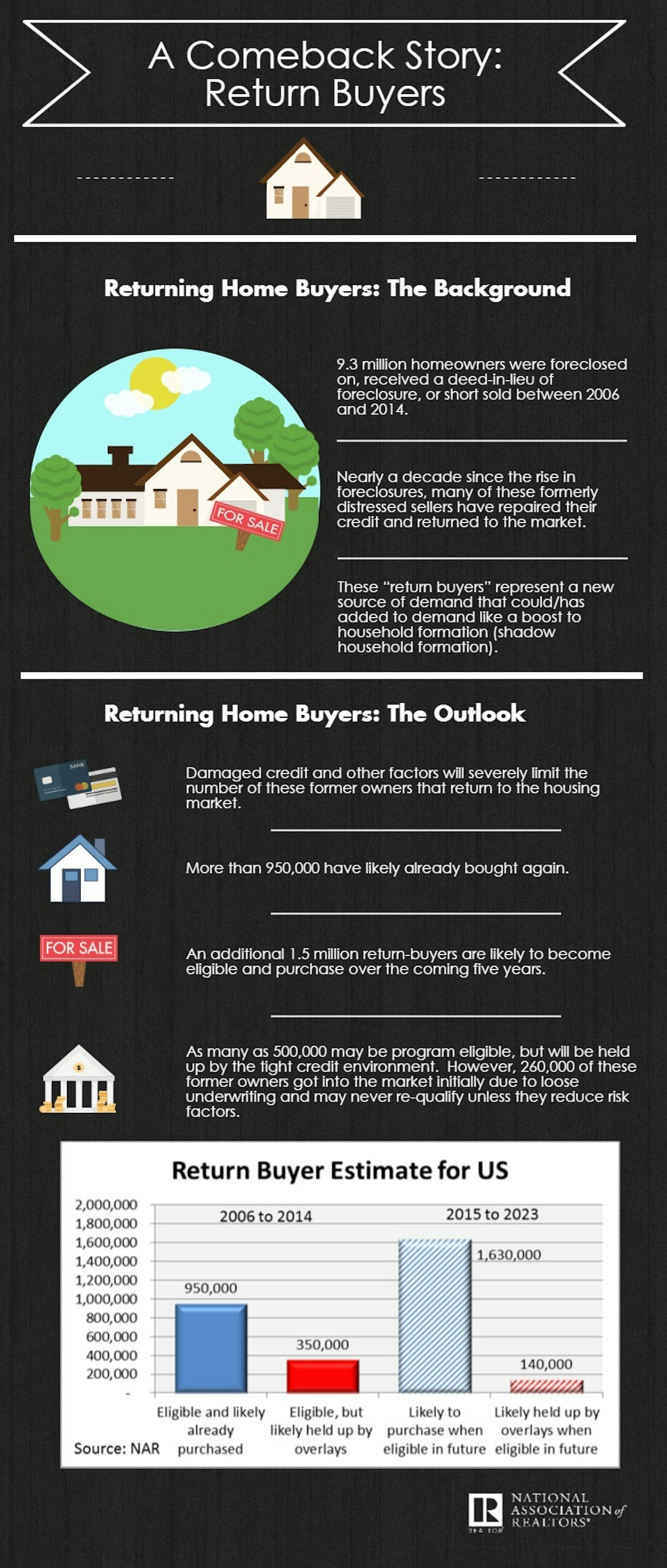 With the housing crash and Great Recession an increasingly distant memory, a growing number of people who lost the home to foreclosure are now trickling back into the market. This week the National Association of Realtors took a close look at these boomerang buyers and found that in addition to the nearly 1 million former homeowners who have likely already purchased a home again, an additional 1.5 million are likely to purchase over the next five years.In Minnesota alone, there have already been an estimated 25,000 return buyers and another 34,000 waiting in the wings. Here's a graphic look at the trend: