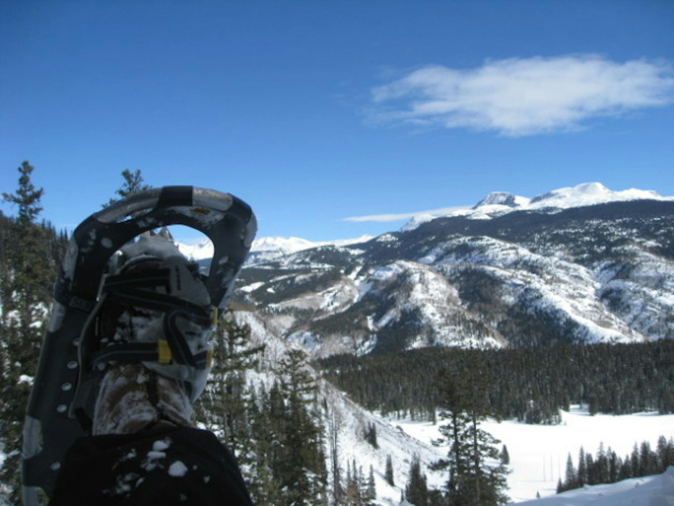 Snowshoes are like tennis raquets. No longer big wooden contraptions. I strap the light aluminum snowshoes around my boots, throw on a packback with some food and water and tromp off. I soon confront a huge dropoff and, despite the snowshoe tracks that seems to scale this cliff, I double back and take a less steep route, tromping and crunching through snow-dusted pines, grabbing views of peaks and valleys balnketed with thick, fresh snow.