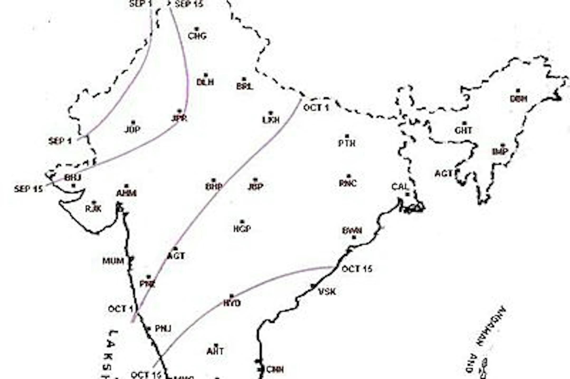Map showing normal withdrawaldates for the India Summer Monsoon. Map credit: India MeteorologyDepartment.The vast weather system known as the Indian Summer Monsoon normally begins nearthe first of June in Sri Lanka and southern India, reaches its fullest extentover the Subcontinent in July, then begins its withdrawal towards the south andeast starting with Pakistan near the first of September.