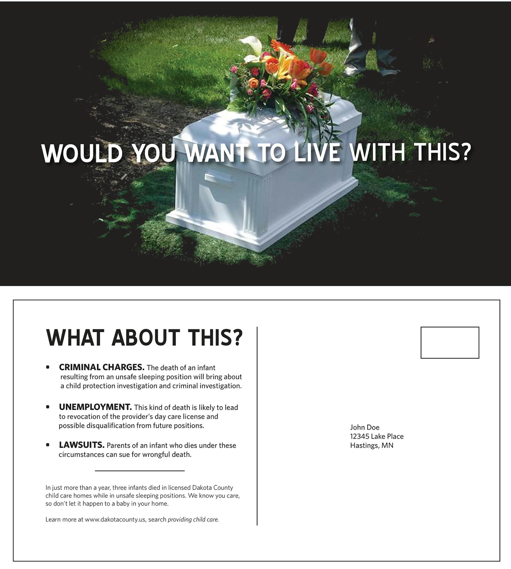The dramatic image is intended to drive home the seriousness of taking a risk with sleep safety and what can happen to the infant — and providers — if they do not put babies safely on their back to sleep, said Gail Plewacki, communications director for the county.
