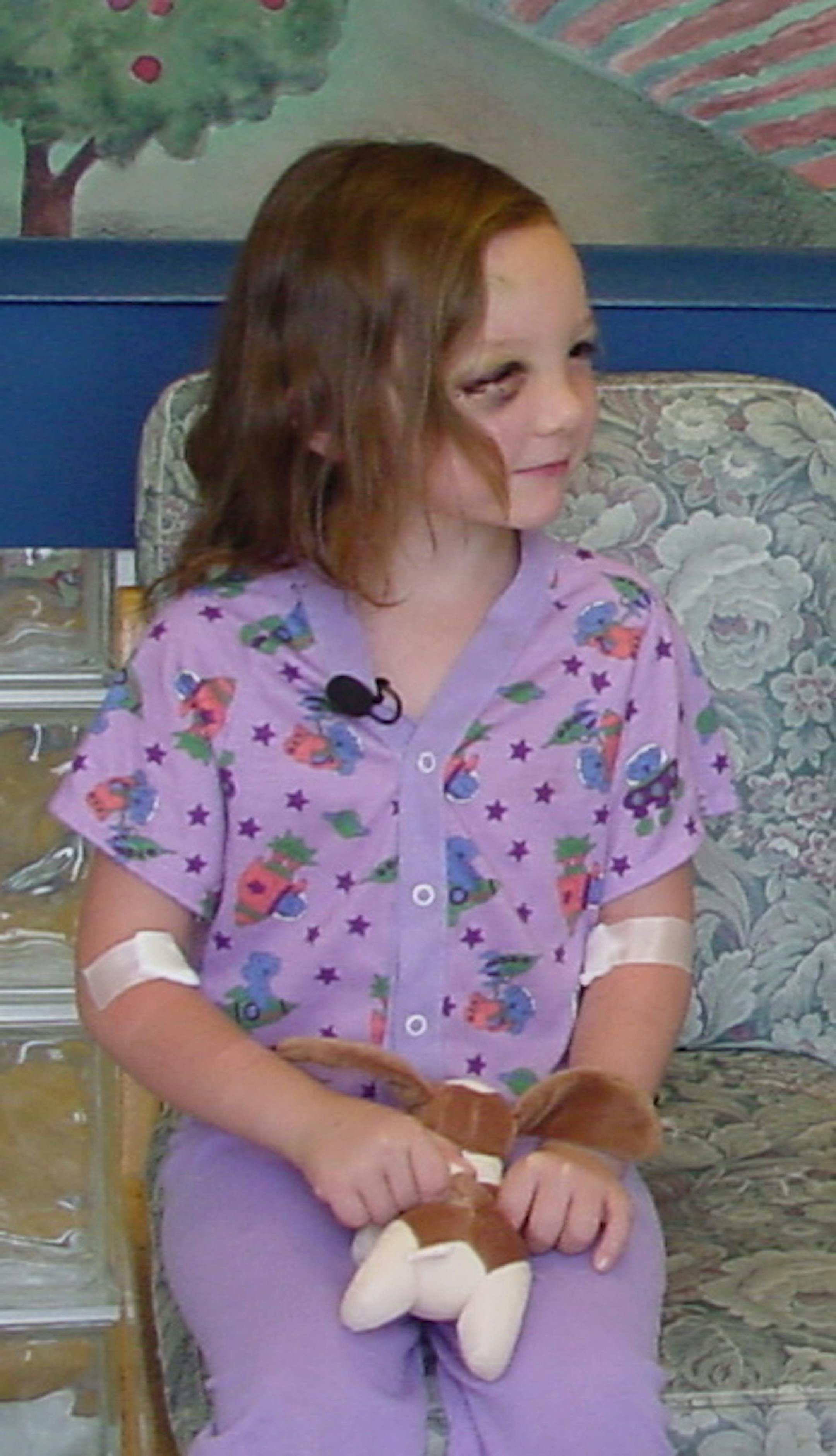 The Harris family in Deerwood, Minn., initially took Stacia to the local ER. The impact had caused some bleeding and her right eye to swell shut. Back home a few days later, she forgot her last name and called her brother "Ariel," which is the name of the household dog. A second imaging scan found bleeding in her brain so Stacia was transferred to HCMC for observation and treatment.