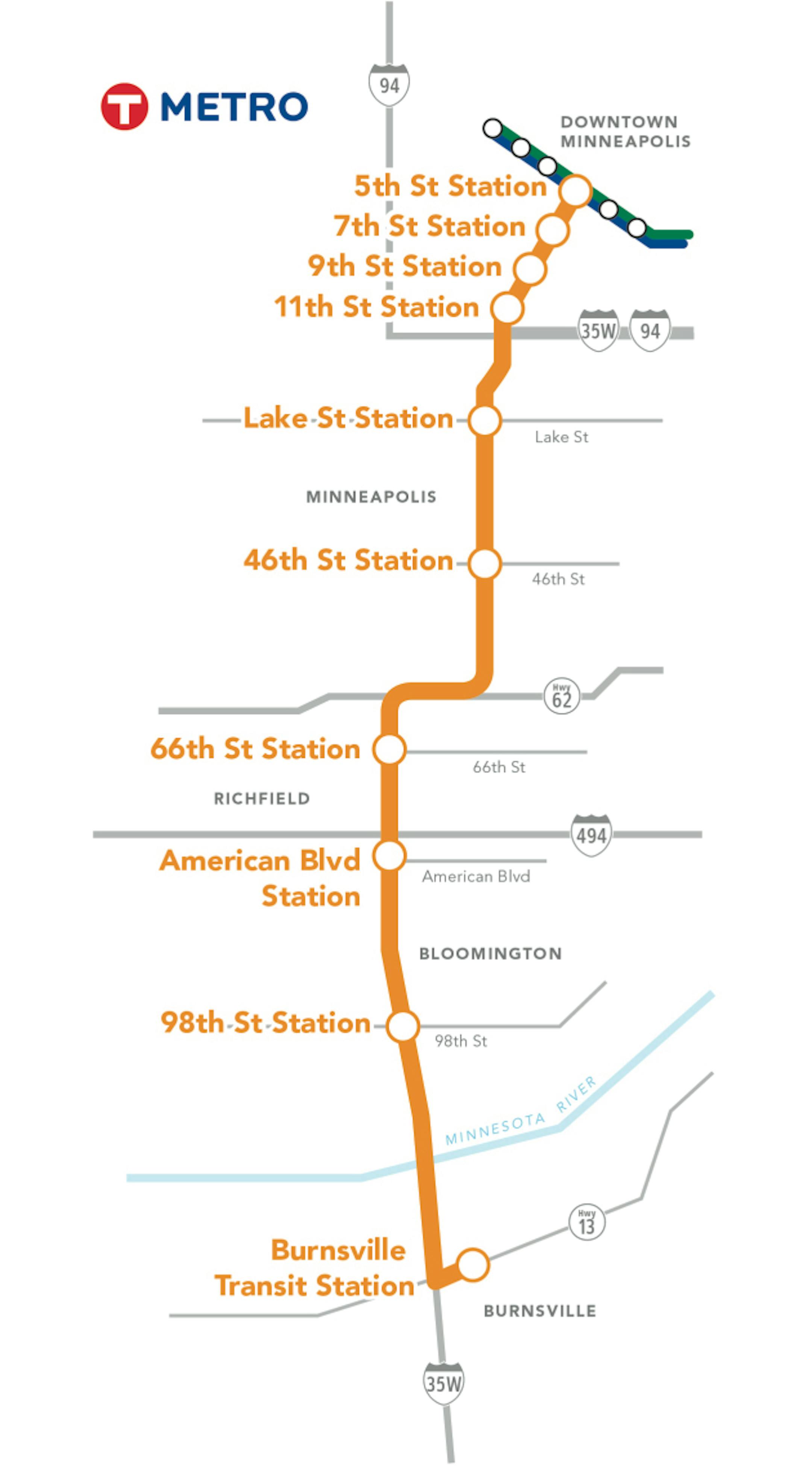 Other stops would be 66th Street, 46th Street, Lake Street along with stops on Marquette Avenue at 11th Street, 9th Street, 7th Street and 5th Street in downtown Minneapolis.