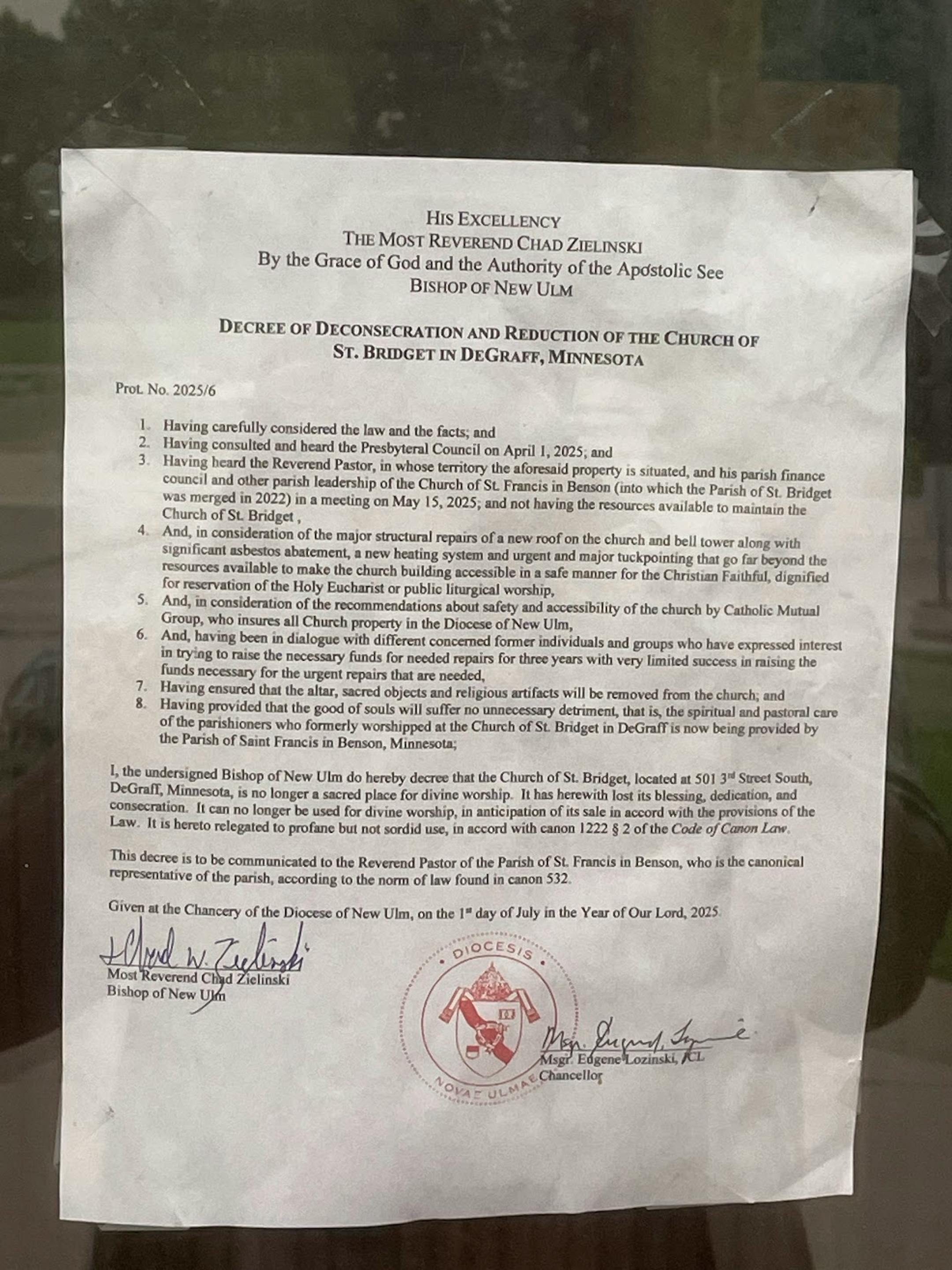 DE GRAFF, MINN. – It was tacked to the inside of the glass doors of St. Bridget’s Catholic Church, a single piece of paper declaring that the 124-year-old building was “no longer a sacred place for divine worship,” in anticipation of its sale.