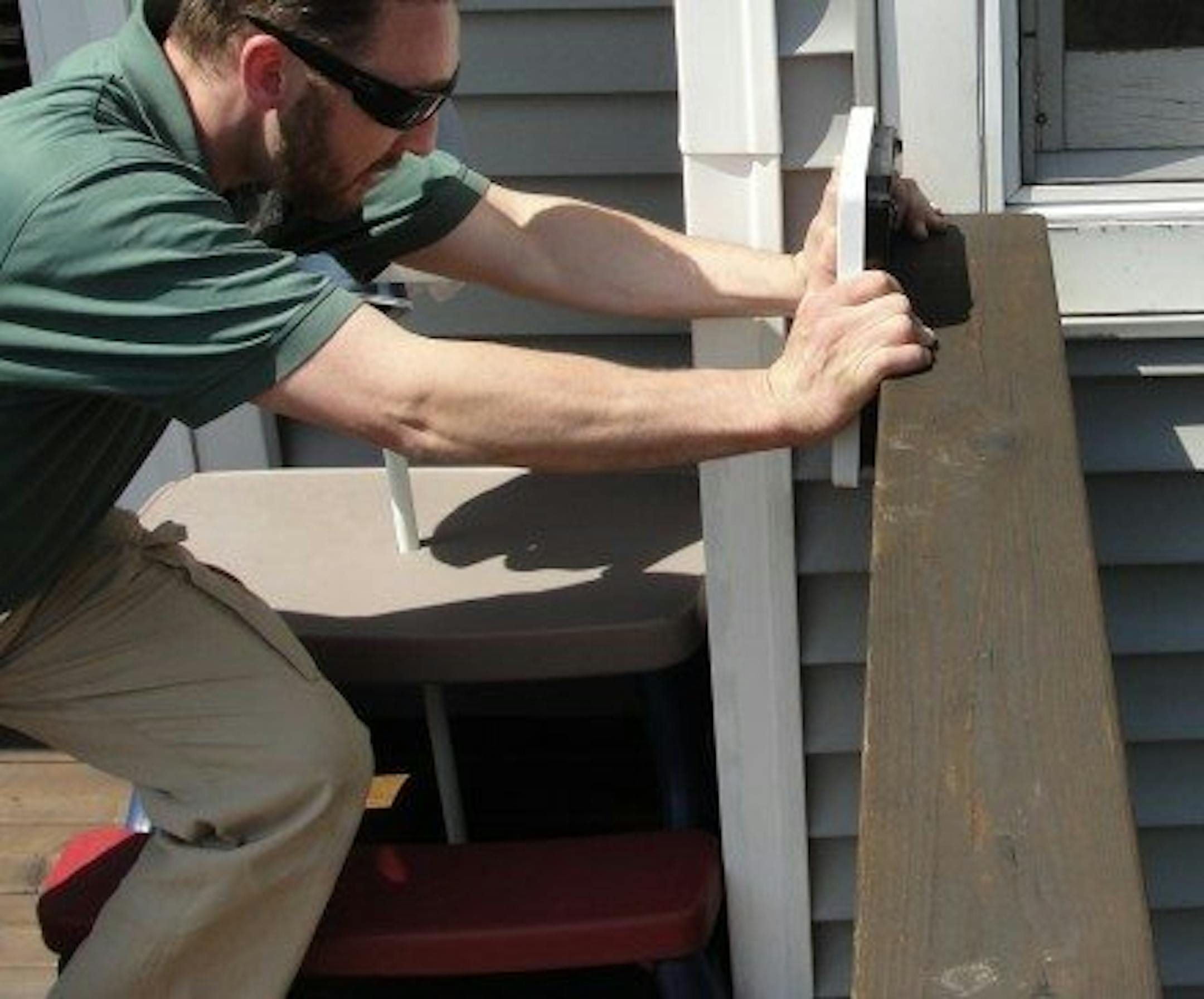 The weakest point in most guardrails is always going to be at the end, where it terminates next to the house. All that typically supports the guardrail at this location is the 4x4 post, assuming posts were used to construct the guardrails. In the photo above, I'm pushing on the guardrail at the end. This guardrail actually performed fairly well - most guardrails won't tolerate nearly that much pressure.