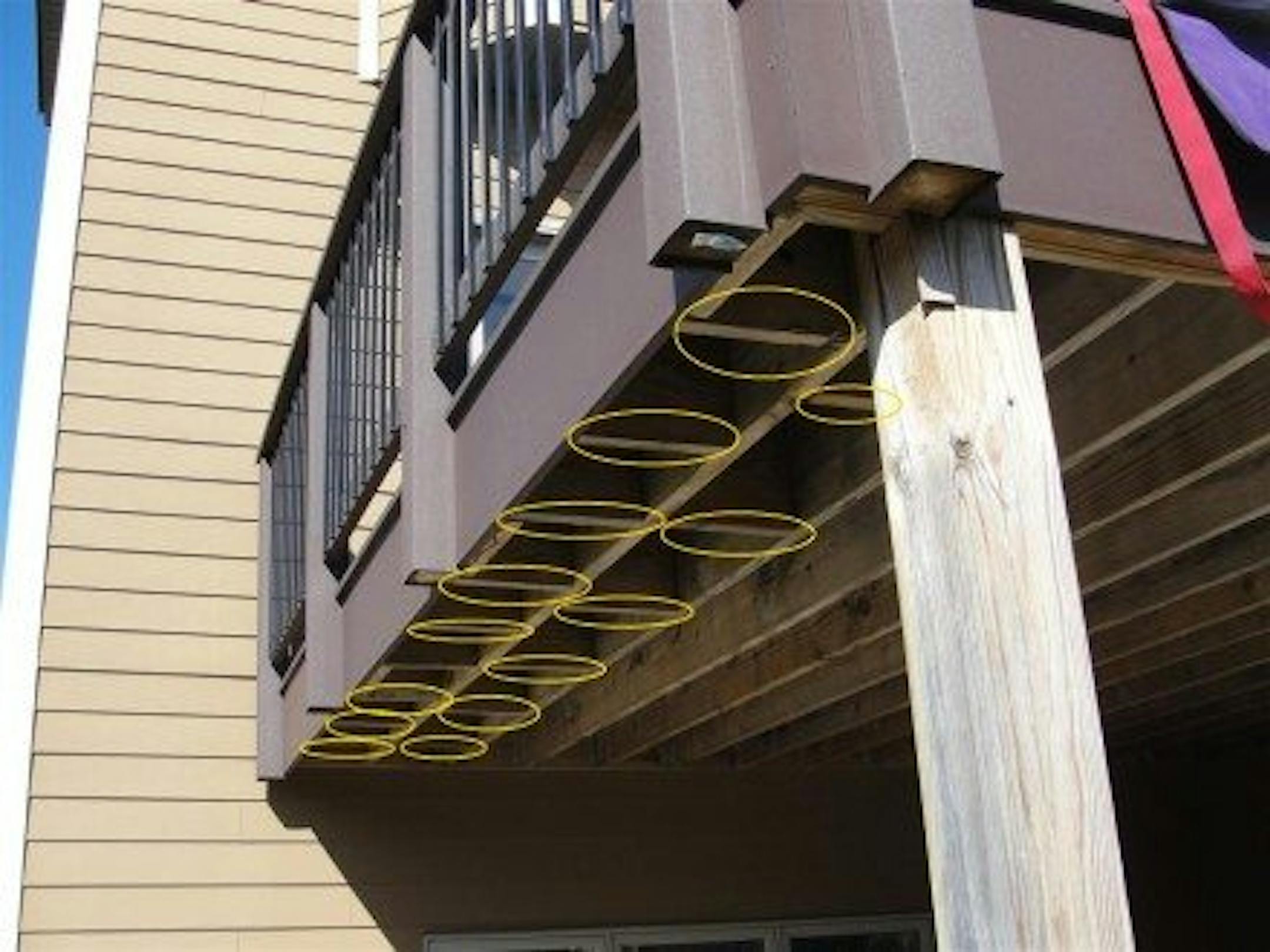 In the photo below, the ovals show where extra blocking was added. This blocking tremendously stiffens the joist that the guardrail is attached to, making it so the guardrail won't budge even when a full 200 lbs of pressure is applied.