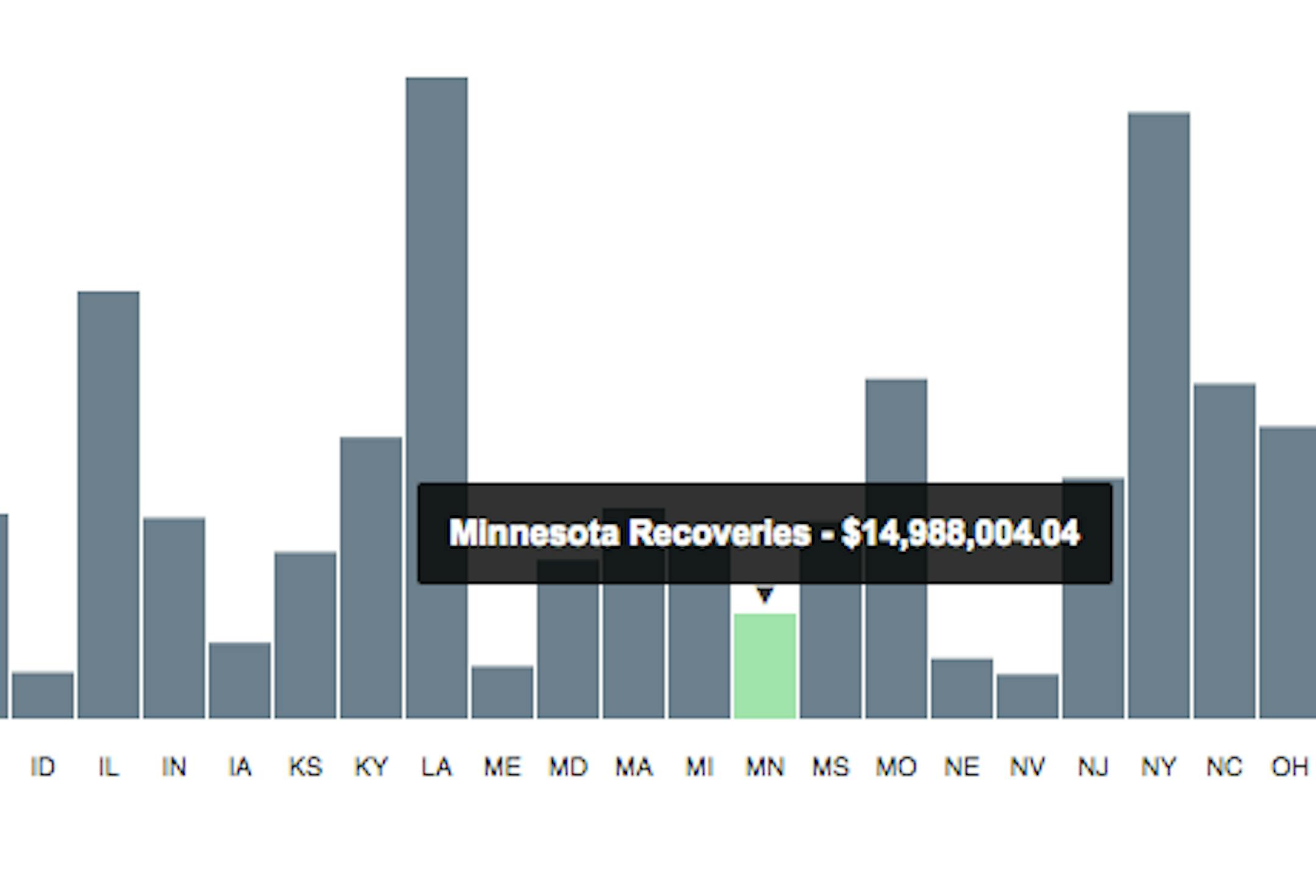 Minnesota lags behind several comparable states, including Missouri and Wisconsin, in recovering money from large Medicaid frauds. Click on the "By State" and "By Amount" buttons to see how Minnesota compares. Source: Office of the Inspector General of the U.S. Department of Health and Human Services