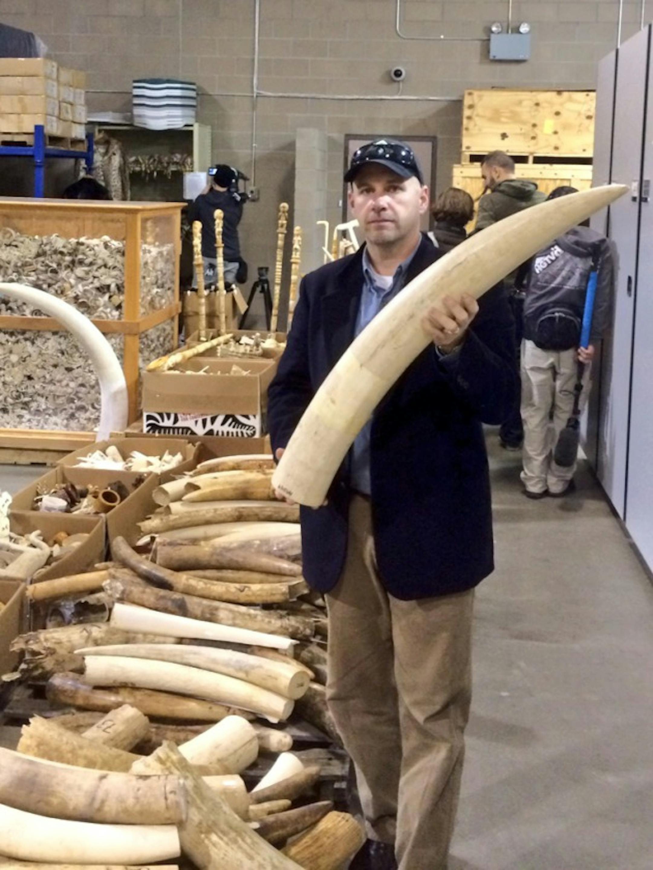 Mitch Petrie holds an Elephant Tusk from the US Stockpile of Ivory This Department of Interior agency stores over 2,000,000 confiscated artifacts being held as part of criminal cases or in many cases, used for educational and training purposes for USFWS inspectors and agents.