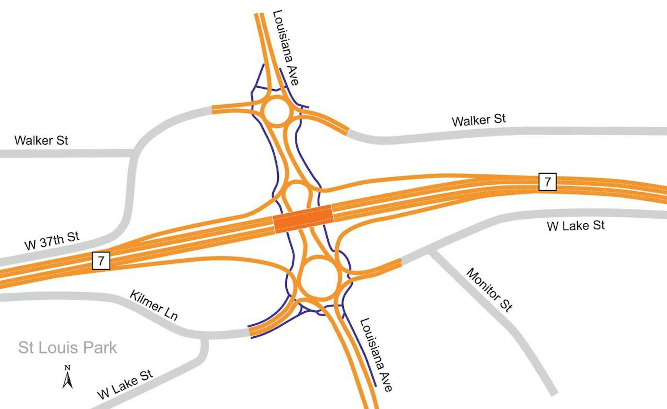 A revamped Louisiana Avenue, meanwhile, will include three new roundabouts that will route traffic on and off the highway, and through rebuilt intersections with two frontage roads, including Walker Street to the north and W. Lake Street to the south.
