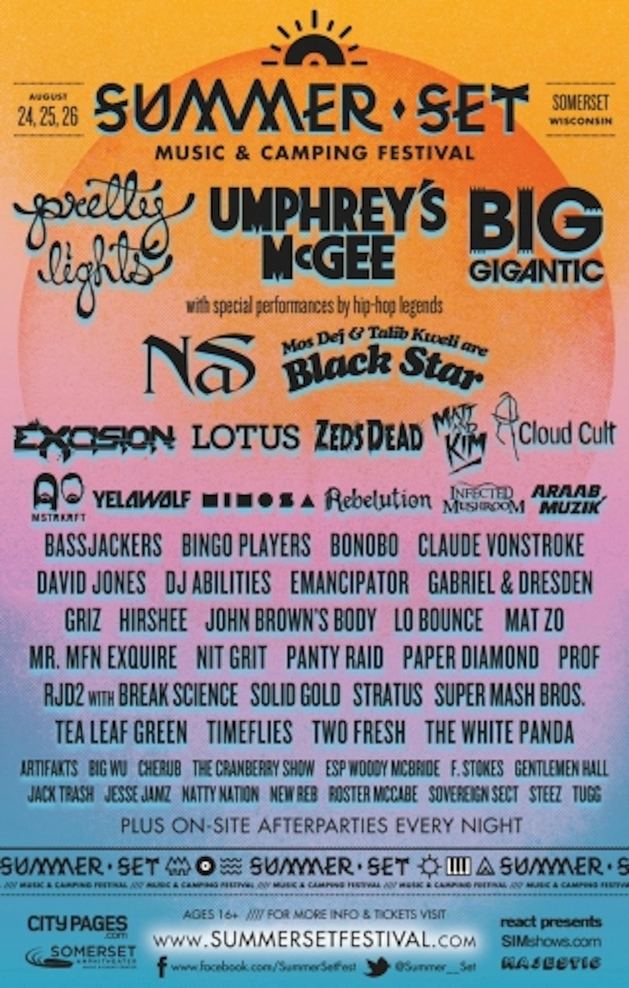 Another S-named music fest for the 89.3 Current DJs to not confuse with Soundtown or Somerset when they're giving away tickets, organizers of the Summer Set Music & Camping Festival at Somerset Amphitheater announced the details of their Aug. 24-26 inaugural event today. The three-day fest will feature an eclectic -- and really pretty odd -- mix of about 50 dance, rap and jam-band acts, including headliners Pretty Lights, Umphrey's McGee, Big Gigantic, Nas, Black Star, Yelawolf, Cloud Cult and MSTRKRFT.
