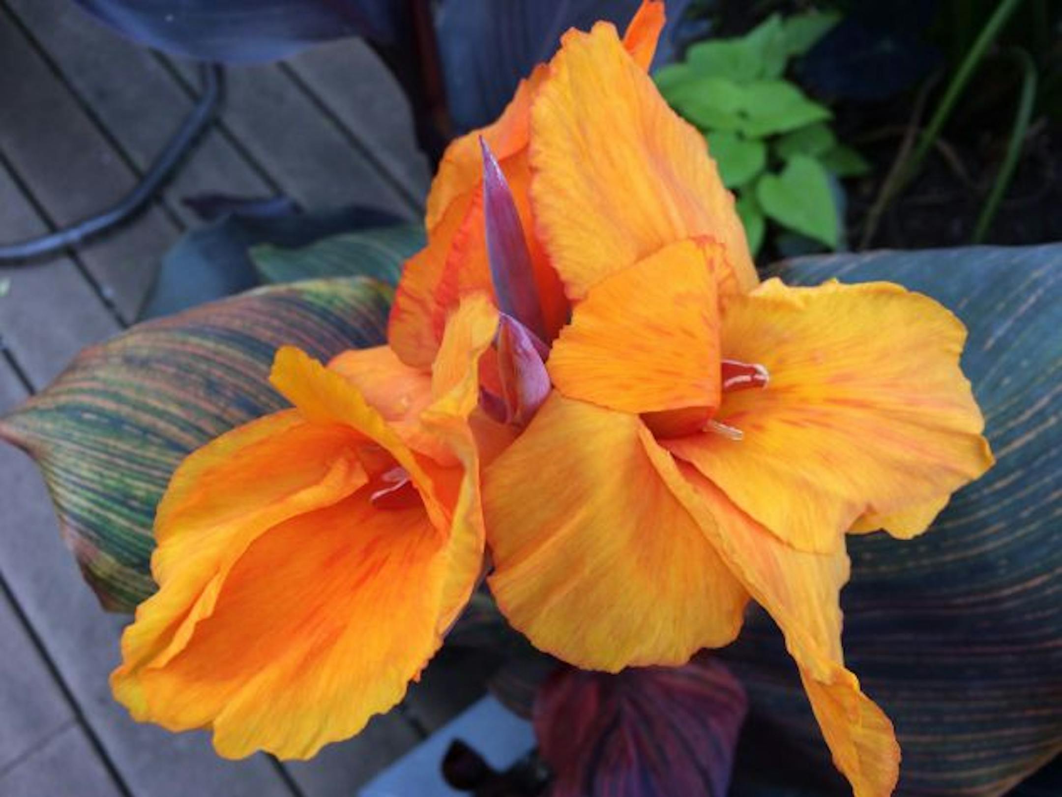 My tropicals are growing hot and heavy, with huge lush foliage and flowers bursting forth like fireworks.