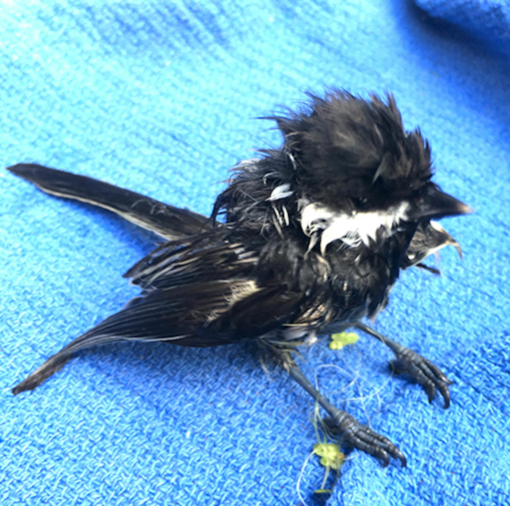 We dried it gently with a small hair dryer (low speed) for about 15 minutes. It didn't try to groom, although its feathers were a mess. It shook once, then flew into a nearby tree.