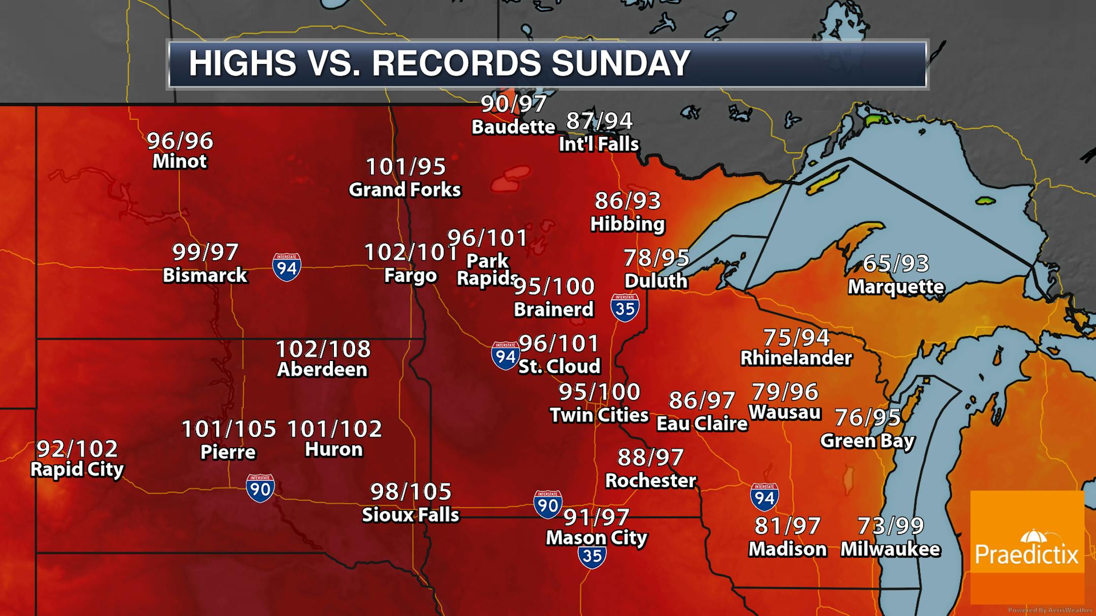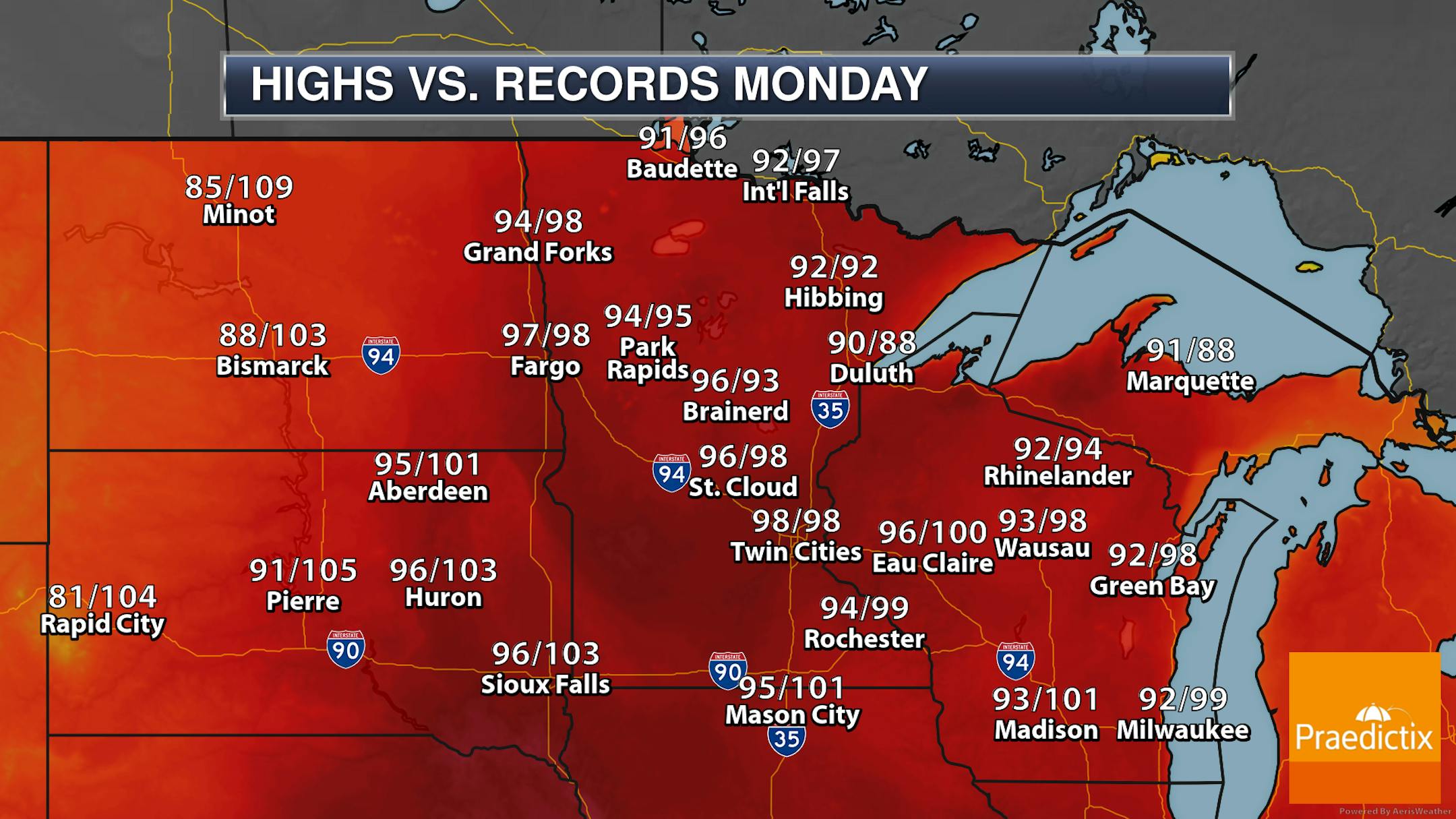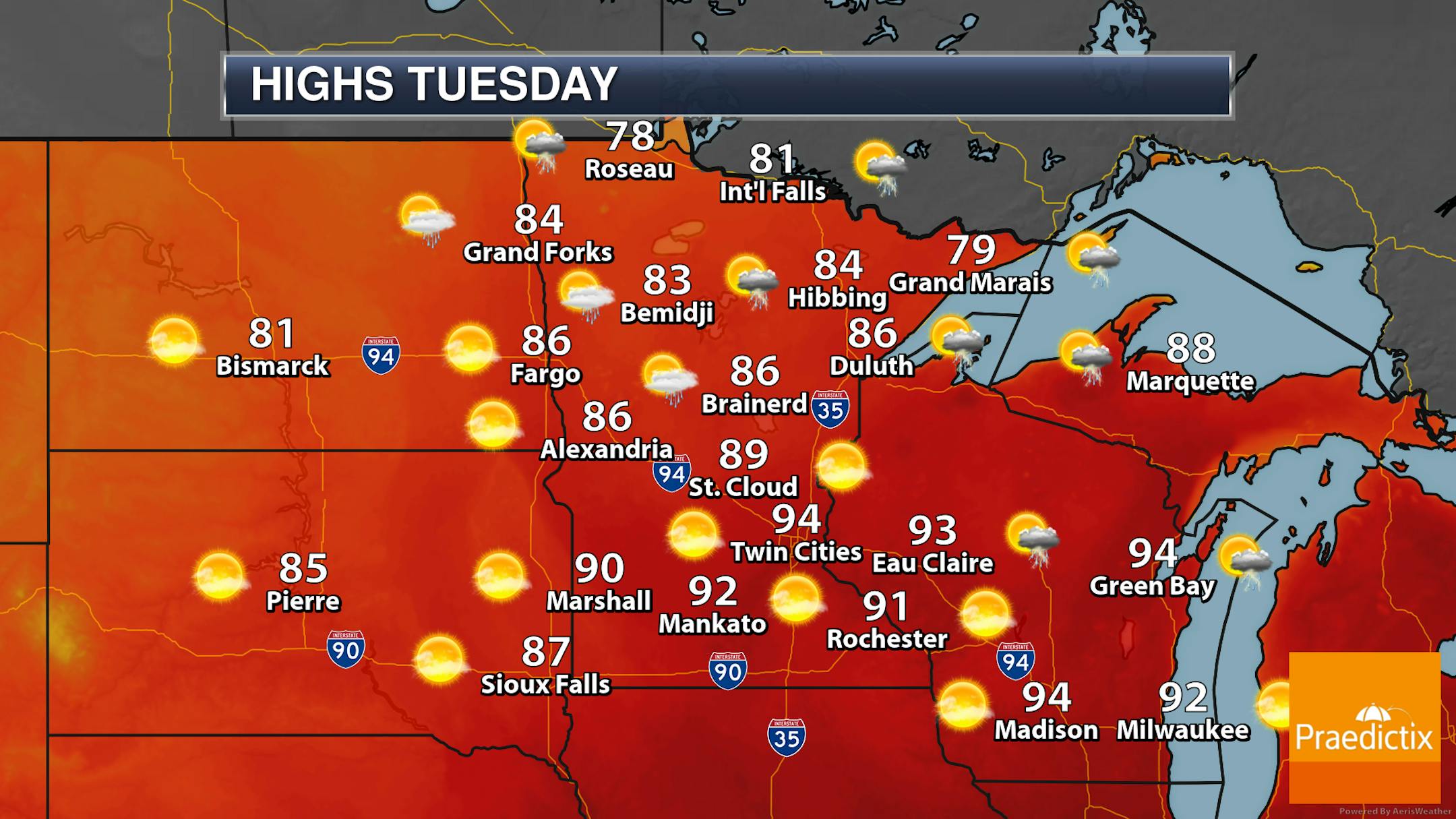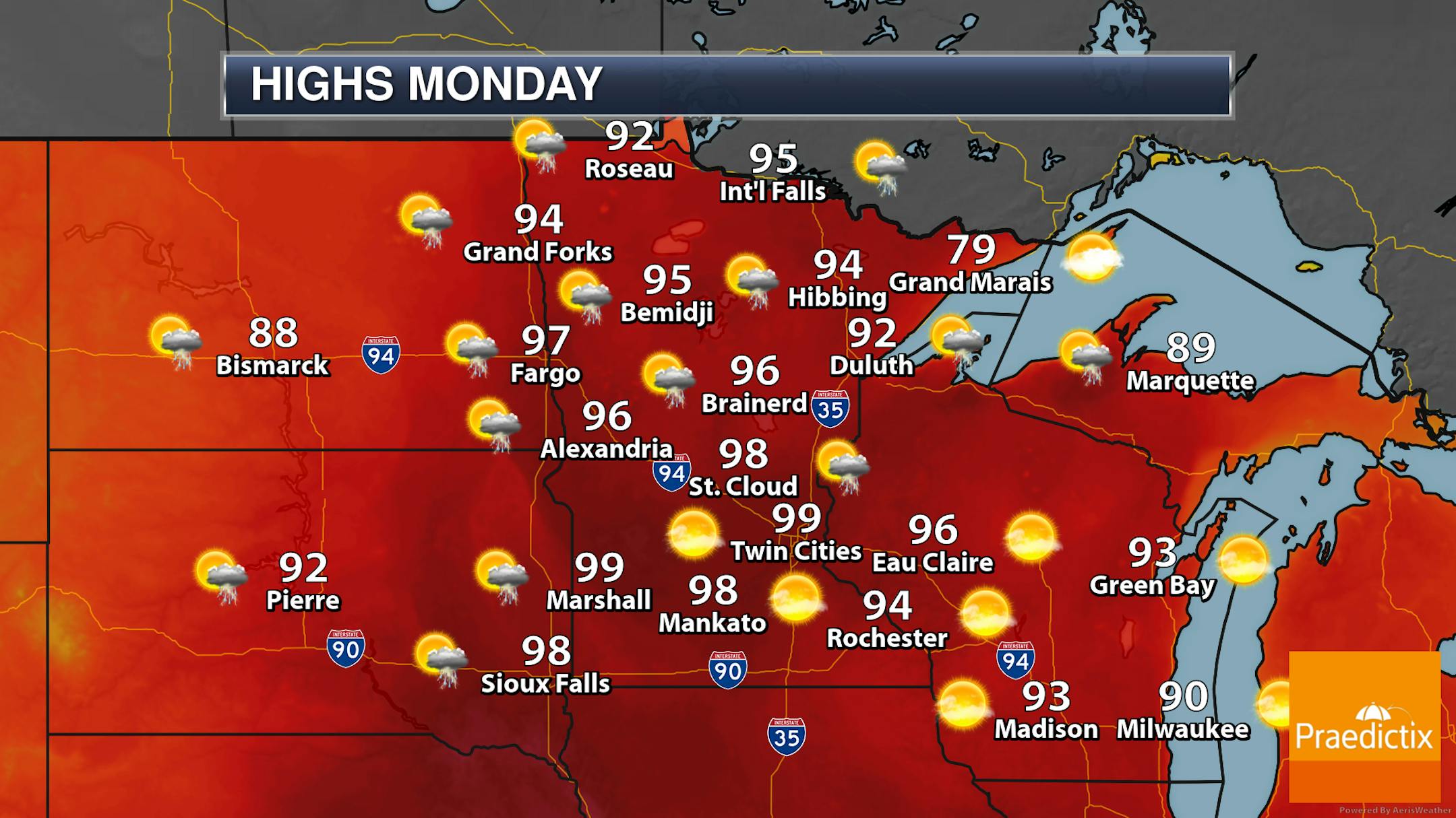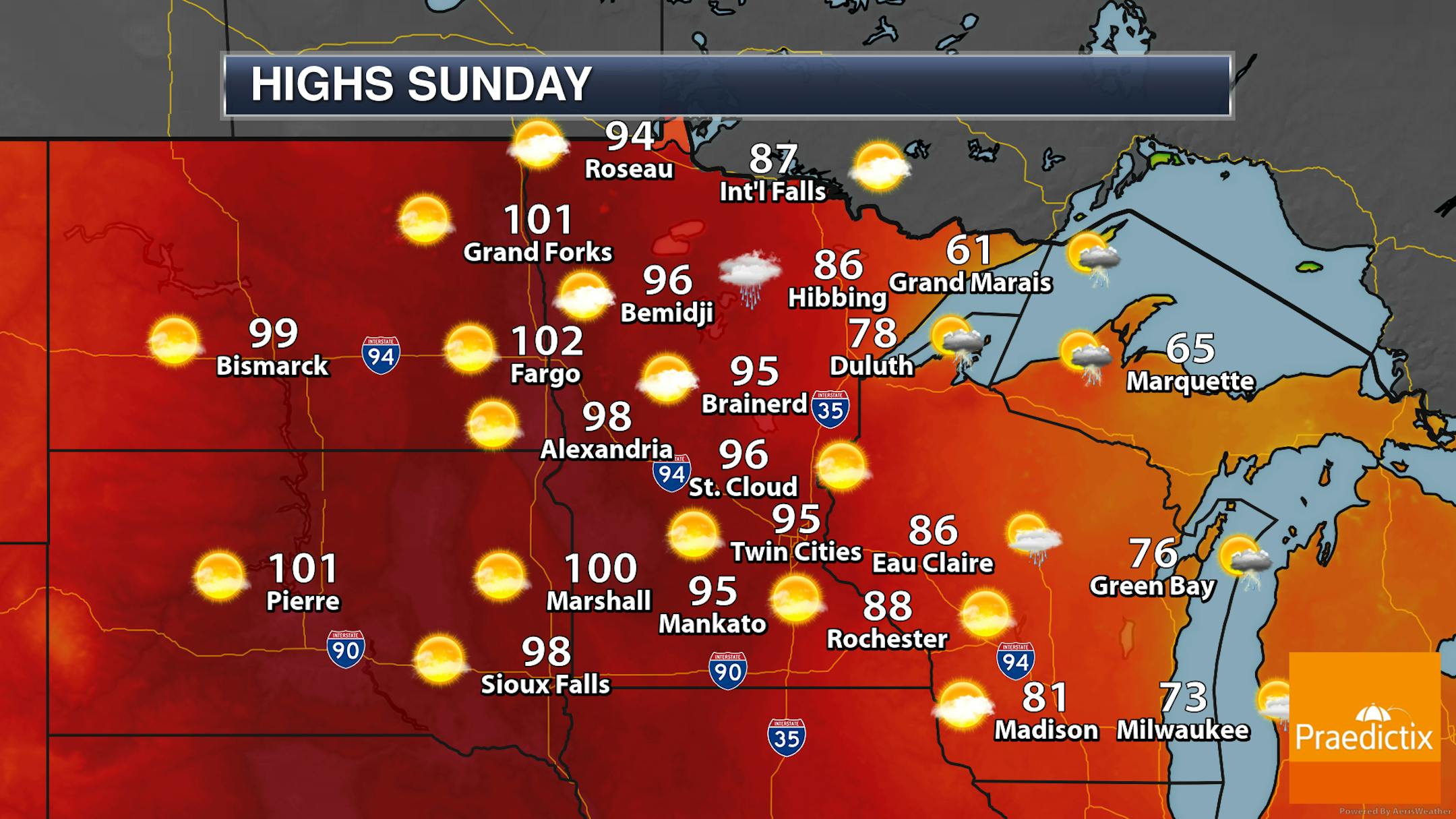 We continue to watch a push of hot air moving across much of the state as we head into Father's Day Sunday and into Monday, with highs at least in the 90s and potentially topping 100F in parts of southern Minnesota. We will start to see temperatures decreasing heading into the middle of the week.