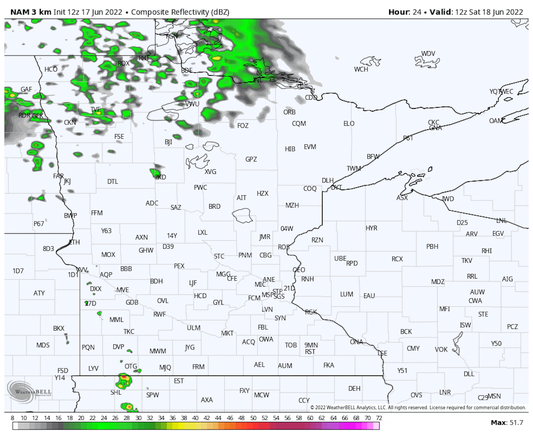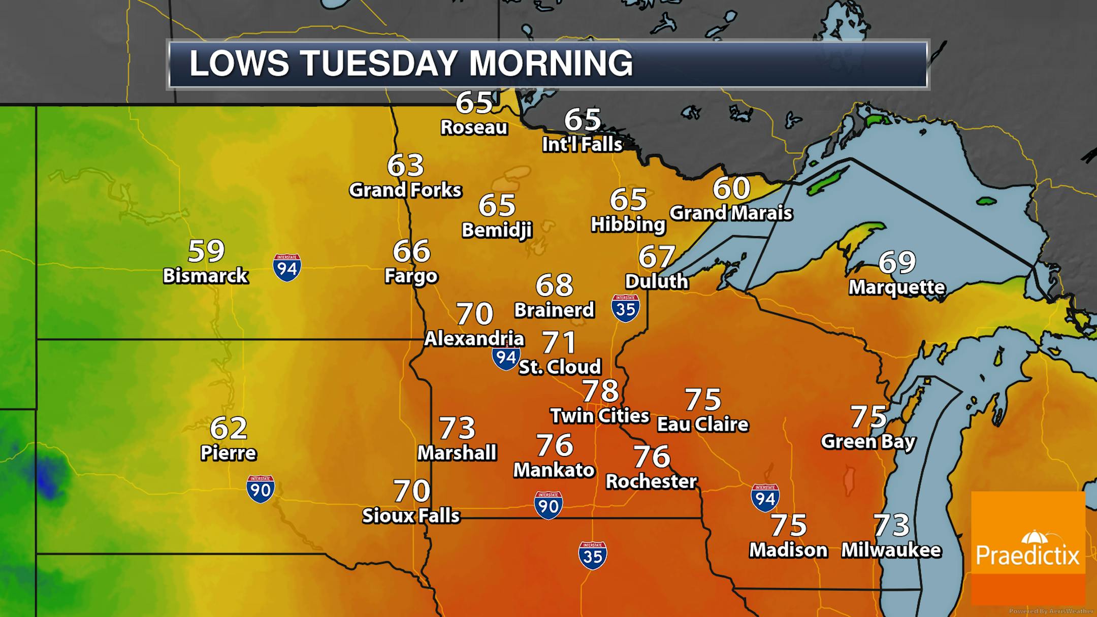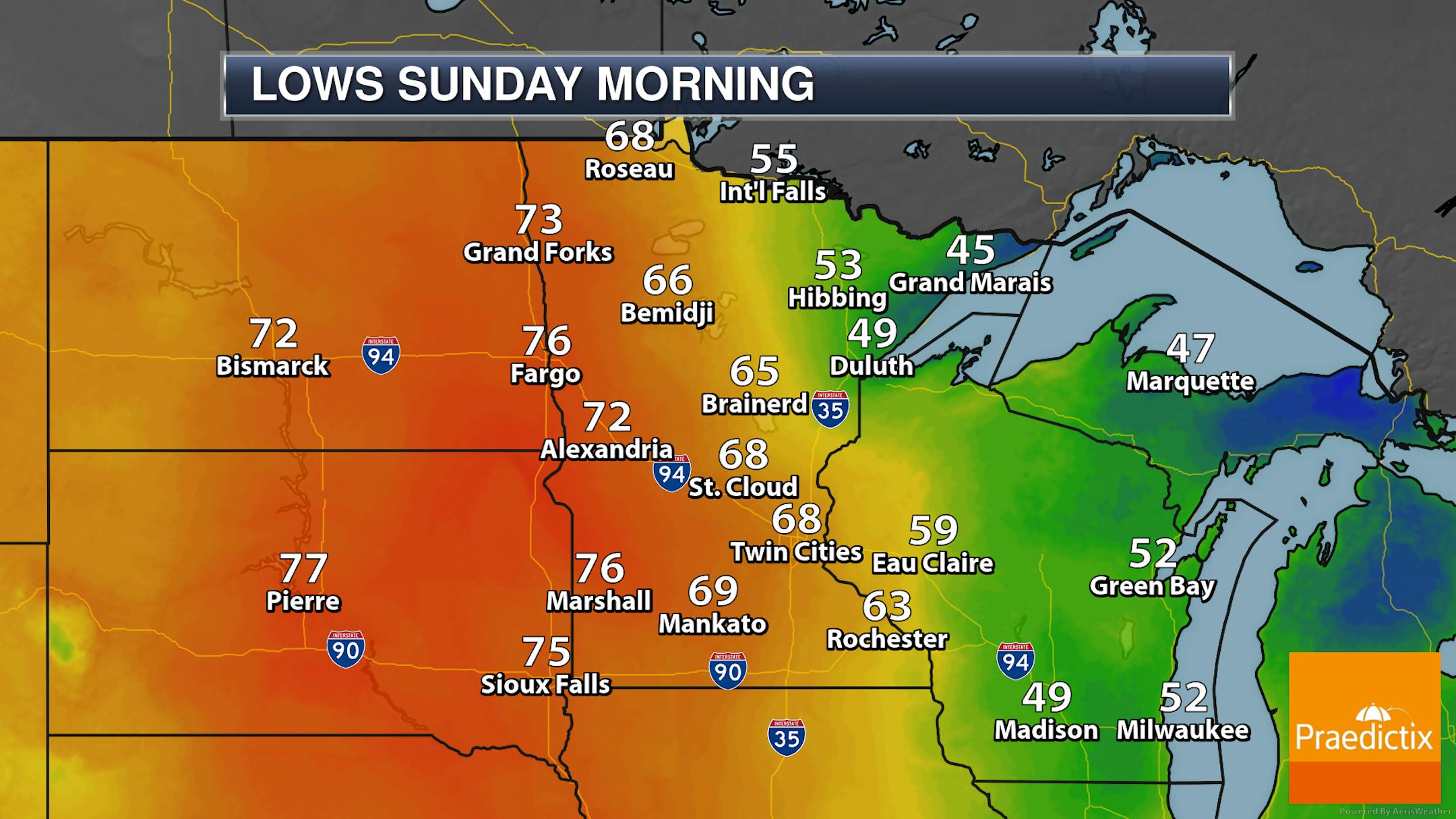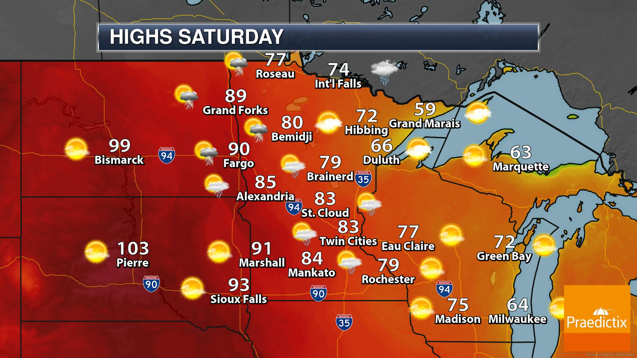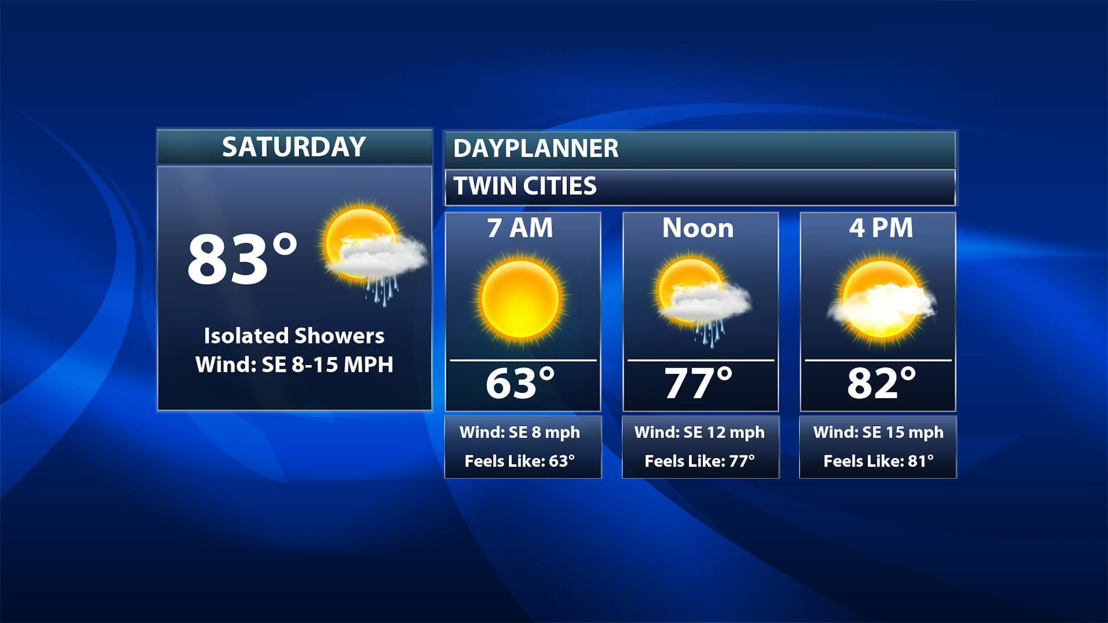 The highest odd of that isolated shower or storm here in the metro would be during the midday/afternoon hours, but again there might be a slightly better chance of seeing a few drops of rain as you head into northern Minnesota. Morning temperatures on Saturday will start off in the low 60s, climbing to the low 80s for highs under mostly sunny skies.