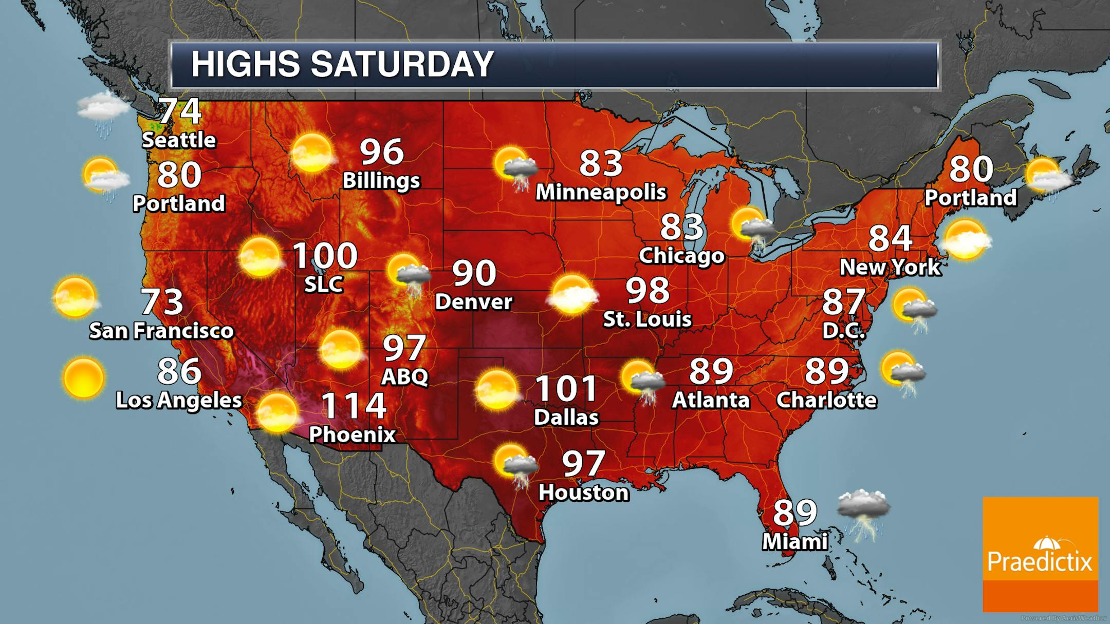 Enjoy the "coolness" of Saturday as we will start to work hotter weather back in as we head toward the second half of the weekend into next week. Highs from Sunday through at least Thursday next week will be at or around 90F, with the warmest days currently expected to be Monday and Tuesday in the low to mid-90s. Sunny skies are expected Sunday and Monday. We watch some storms potential Monday Night into Tuesday morning (mainly off to our north) and then again Tuesday Night. The storms Tuesday Night will help usher in "slightly" cooler weather Wednesday (only by a handful of degrees).