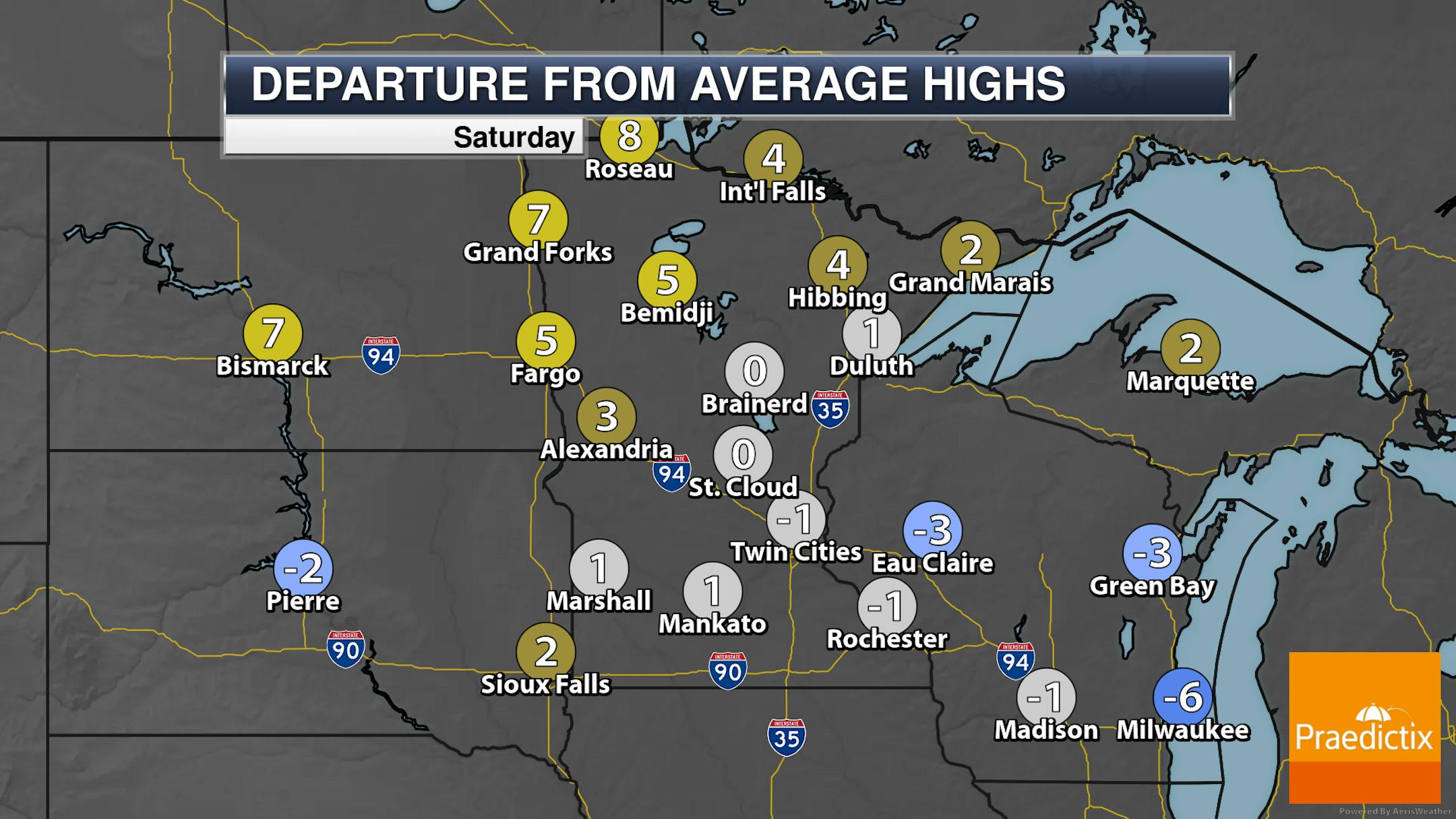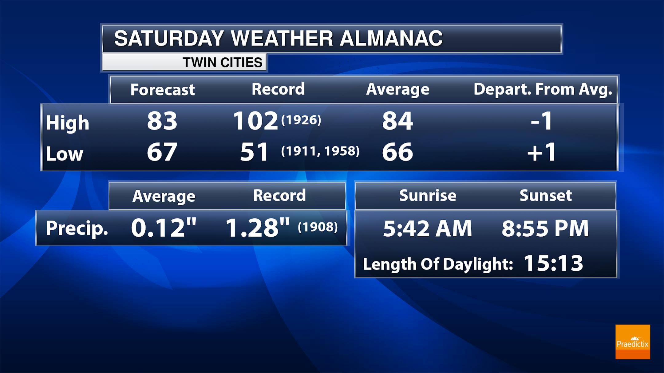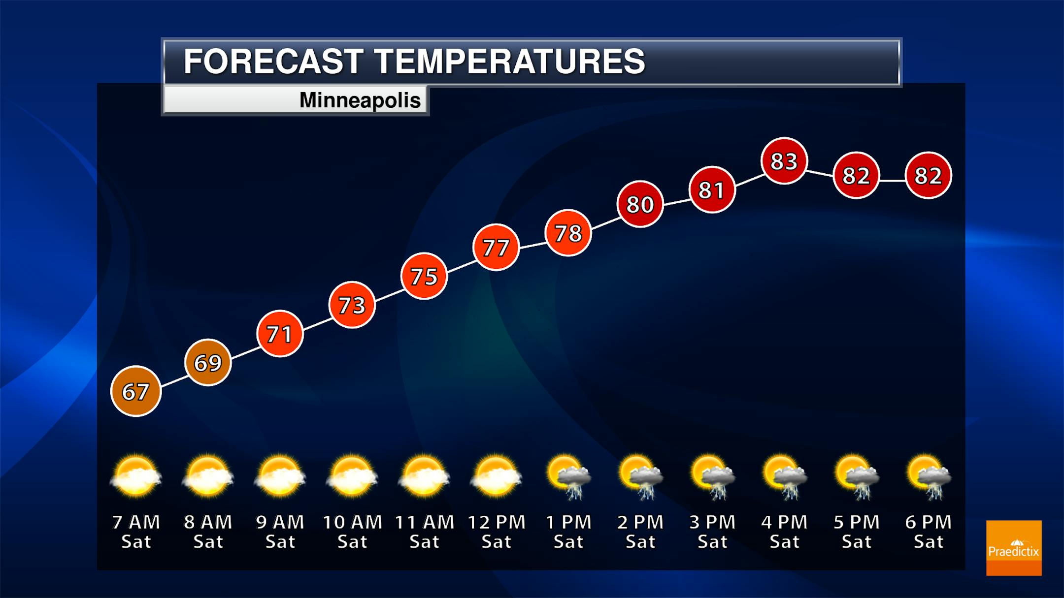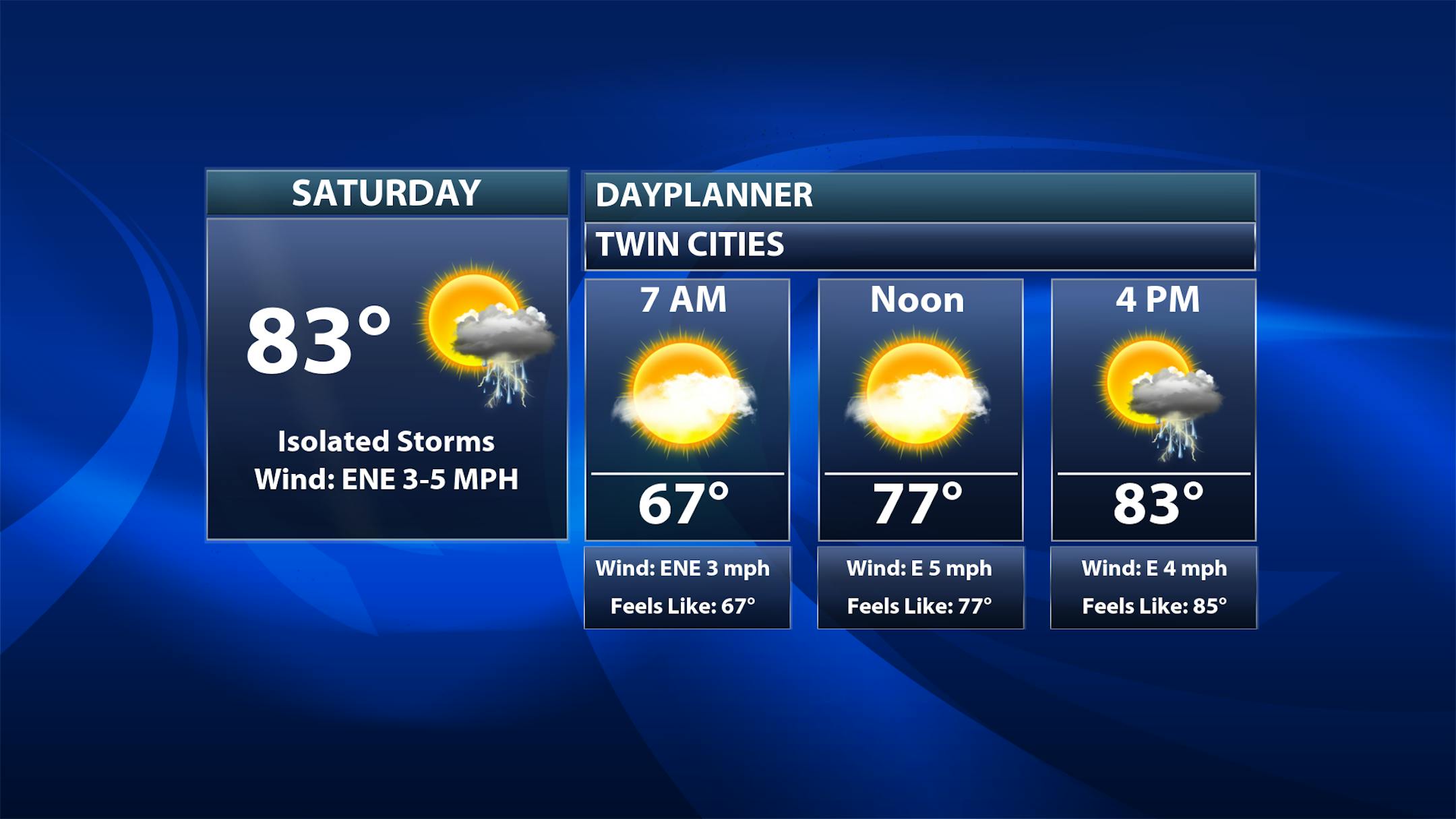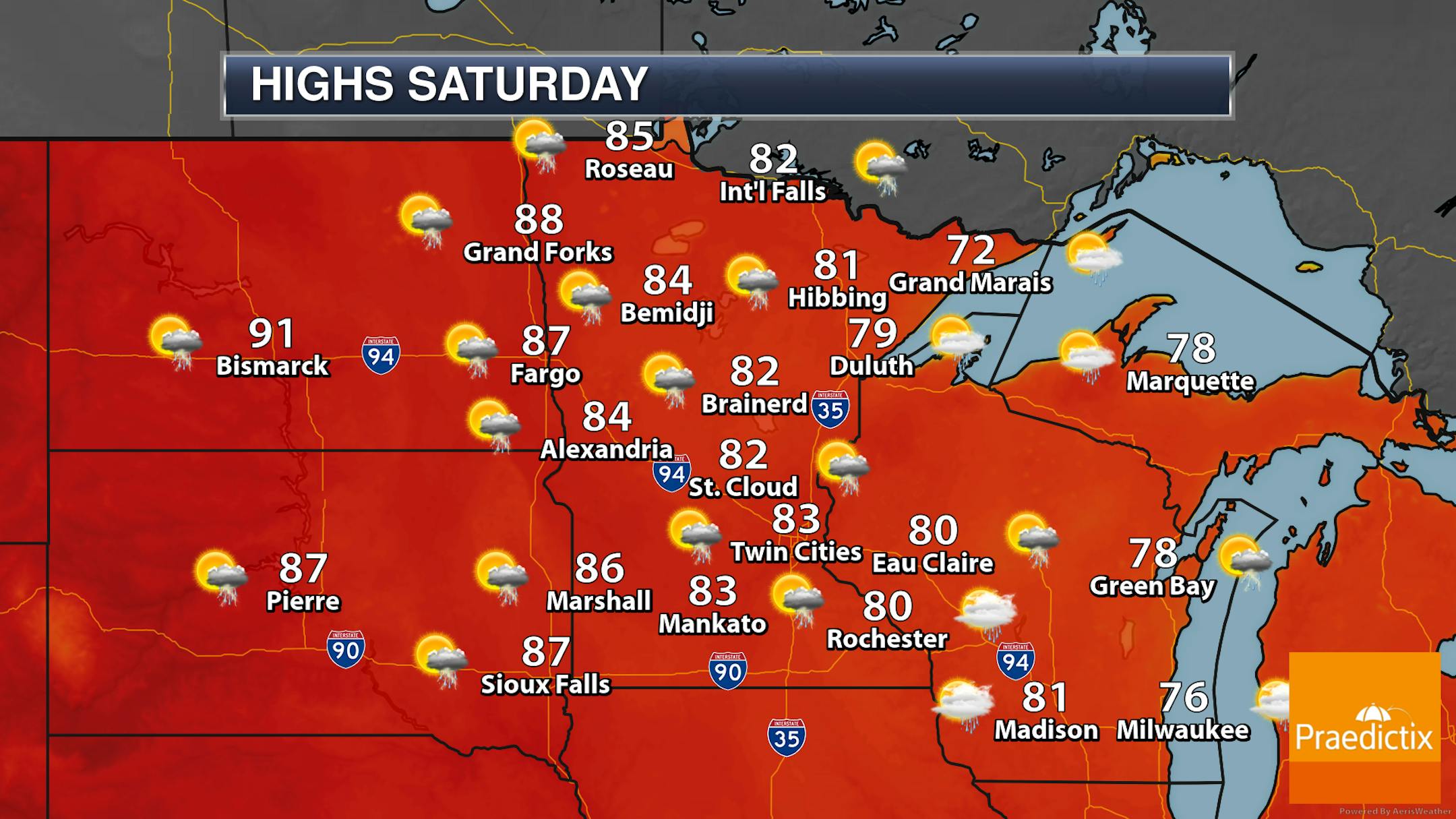 As we look statewide, I think the odds of a few showers or storms will be higher during the afternoon into the overnight hours out across portions of western and northern Minnesota. Highs will climb into the 80s across much of the state, with 70s in parts of northern Minnesota and along the North Shore.